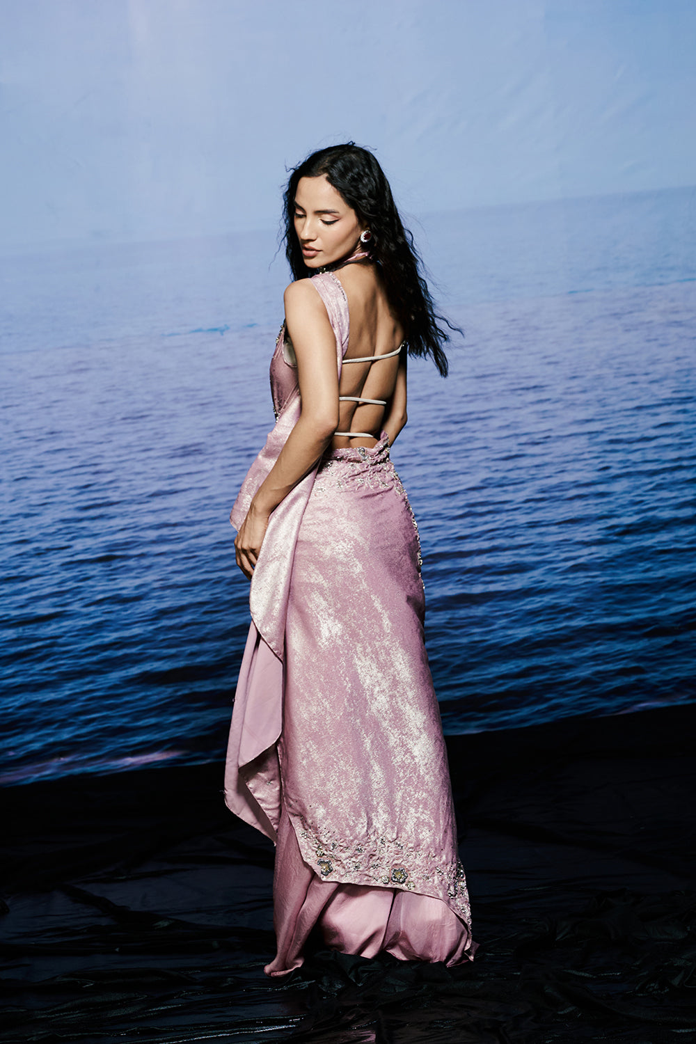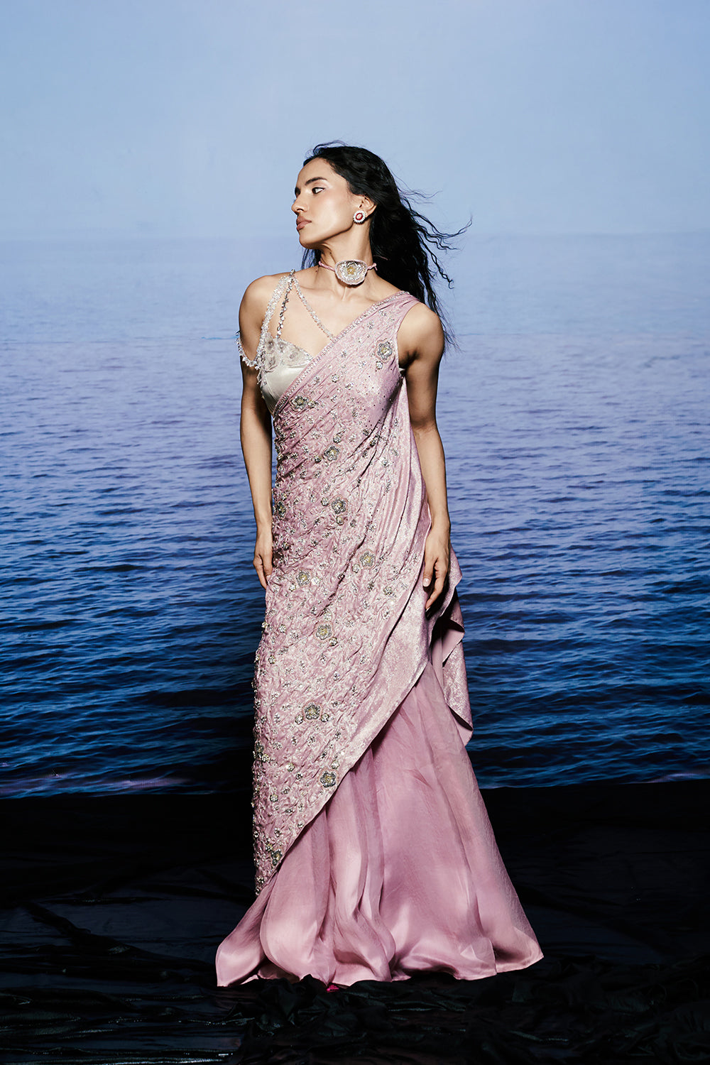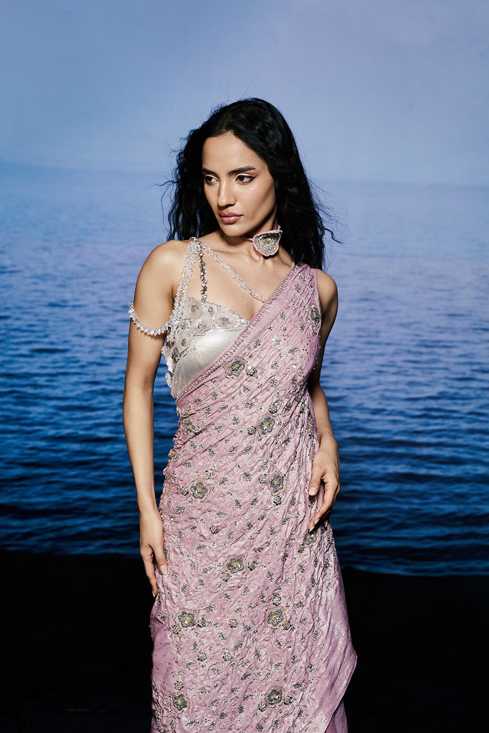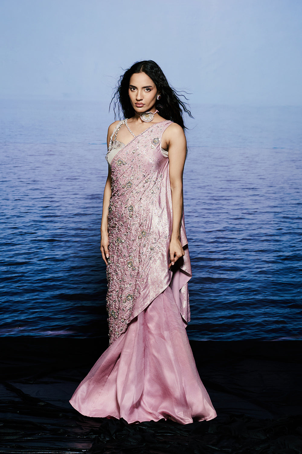 Romance meets rebellion in Blush Eclipse. Crafted in soft rose with delicate hand embroidery, the drape flows like waves meeting the shore. The sculpted cape pallu with a bustier blouse is traced with glimmering crystals, catching light with every movement — a subtle shimmer that elevates softness into quiet power. Gentle yet commanding, this look embodies strength in its most graceful form.