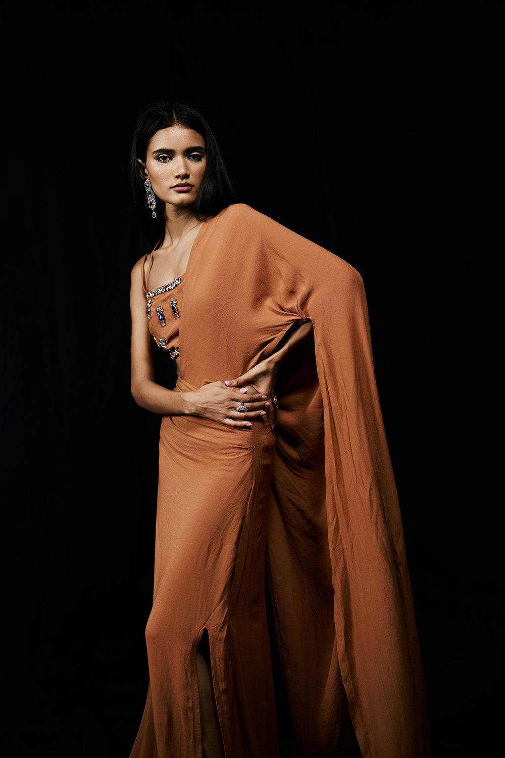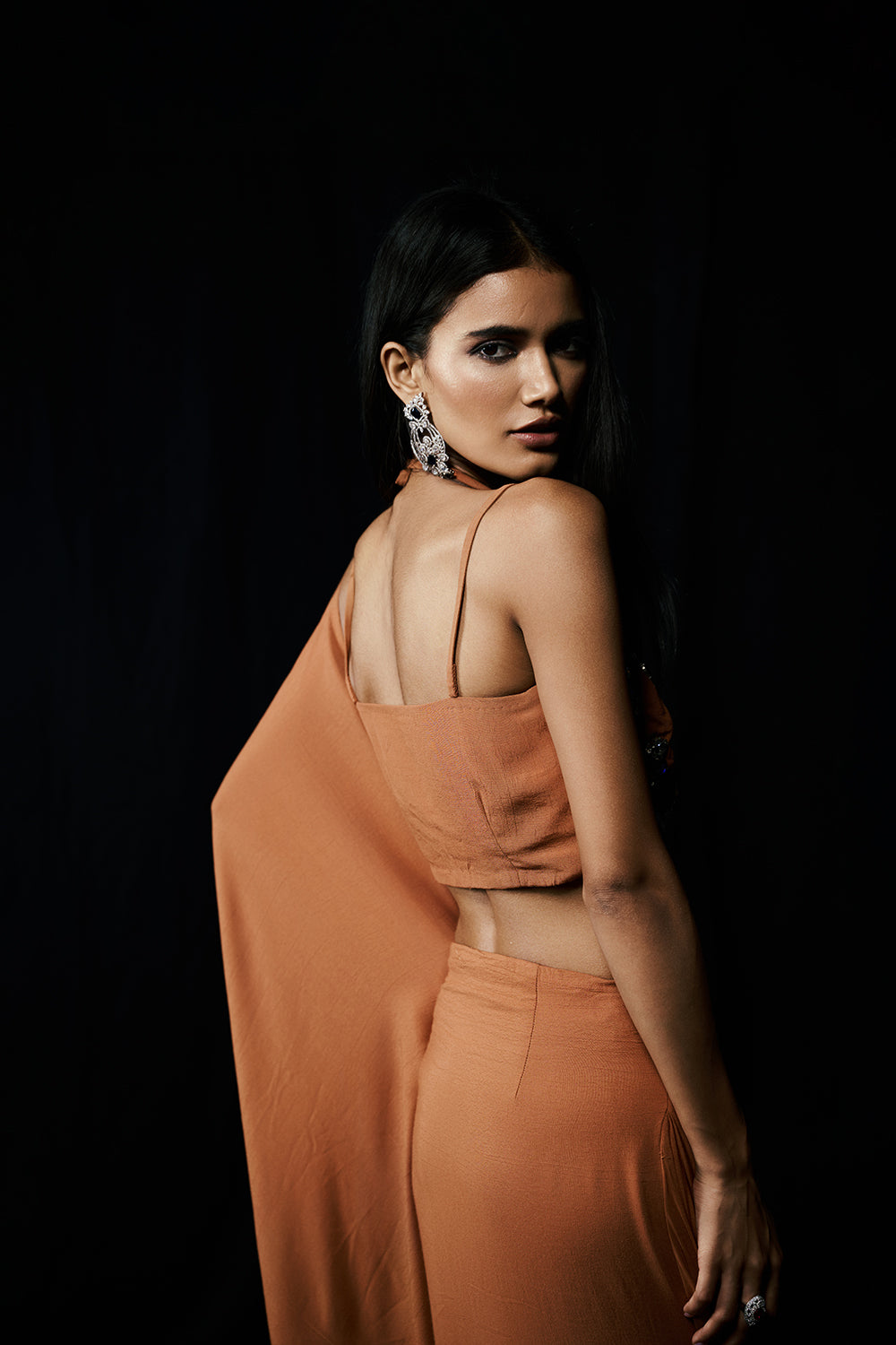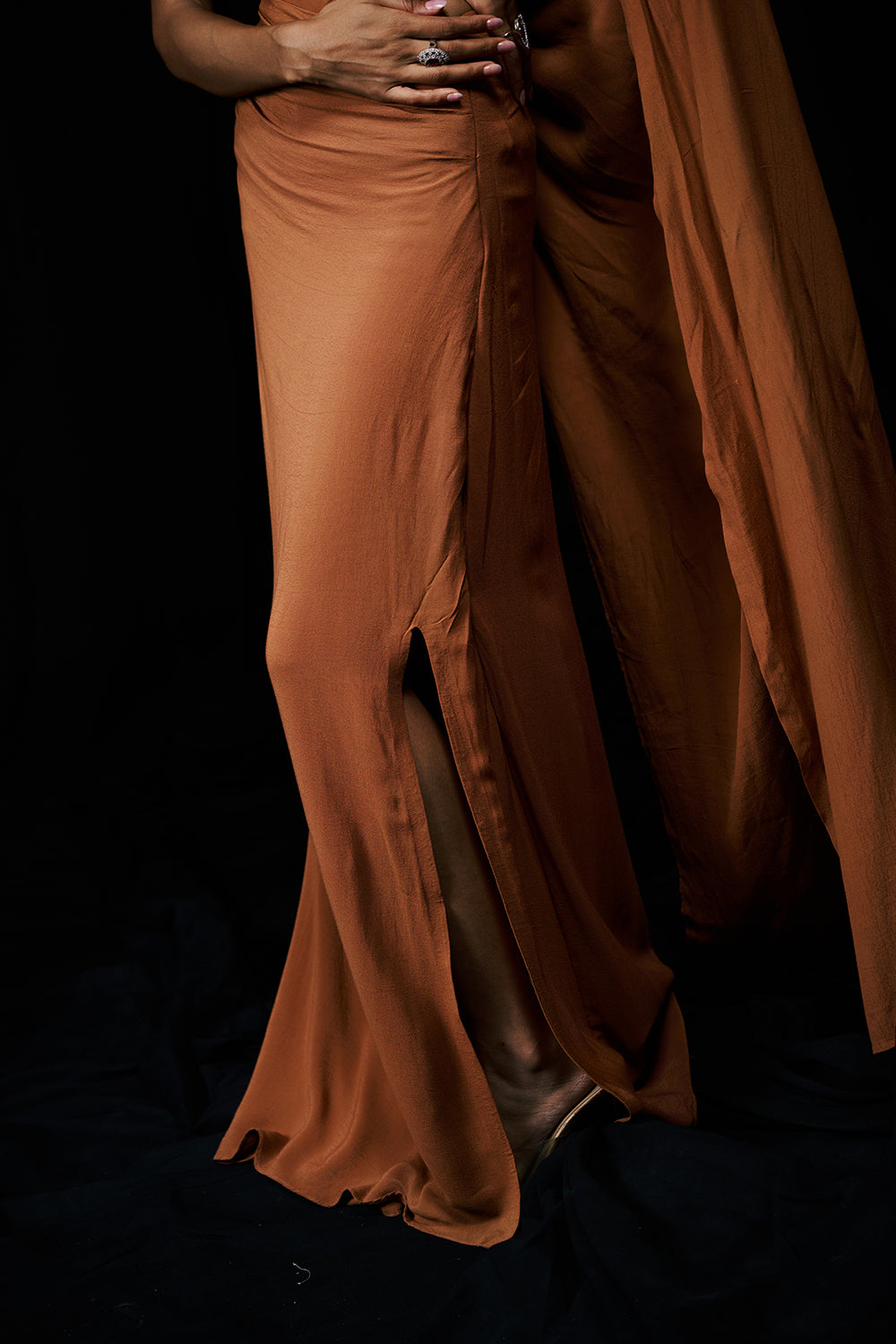 In midnight tones and plush textures, Clay Serenade Drape is crafted for the woman who thrives in the after-hours. Luxurious velvet meets liquid satin draping, held together with an accent chain that doesn’t confine—it liberates. Dark, opulent, and magnetic.