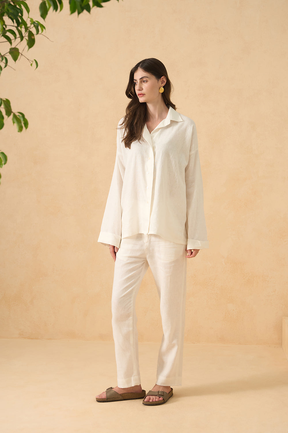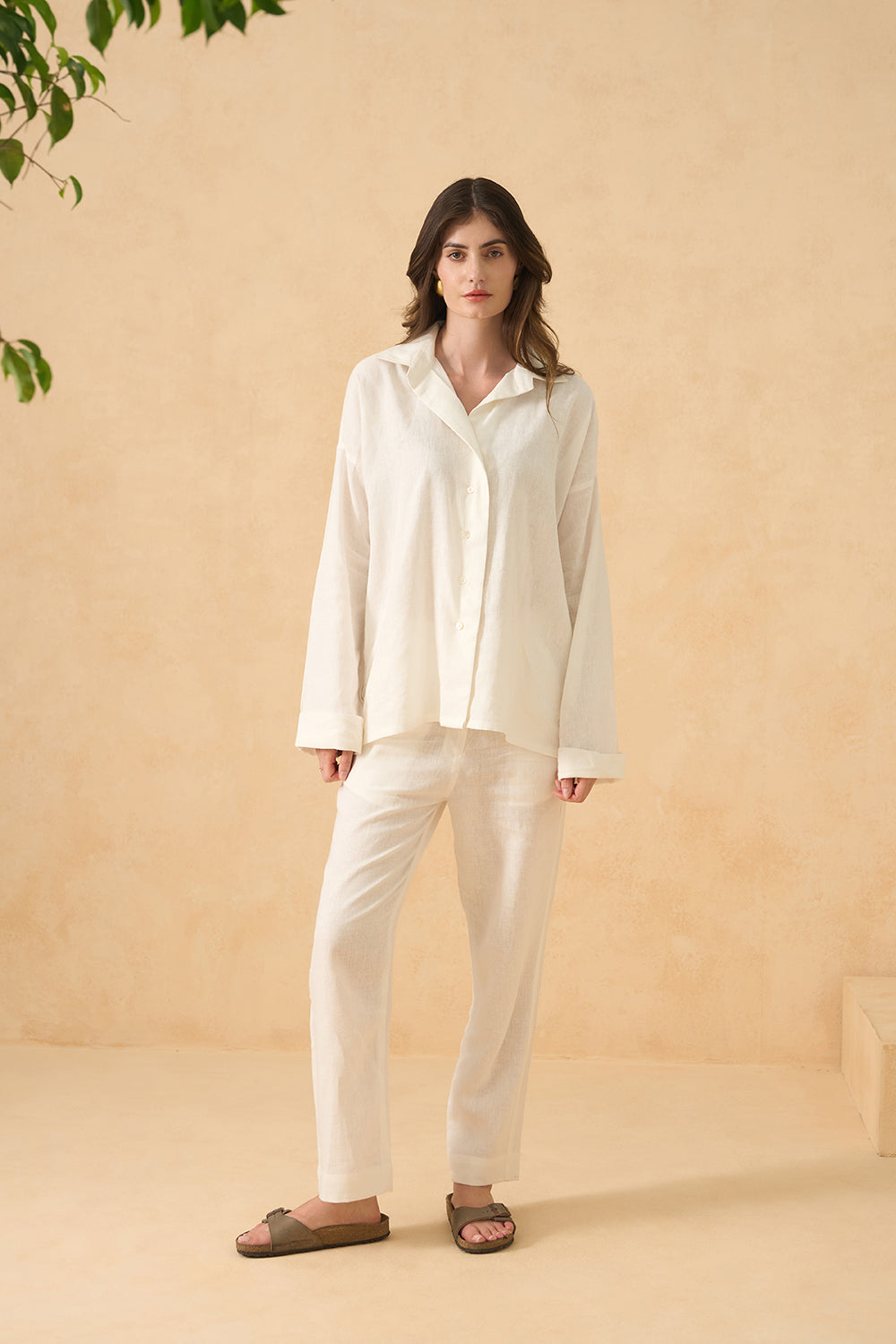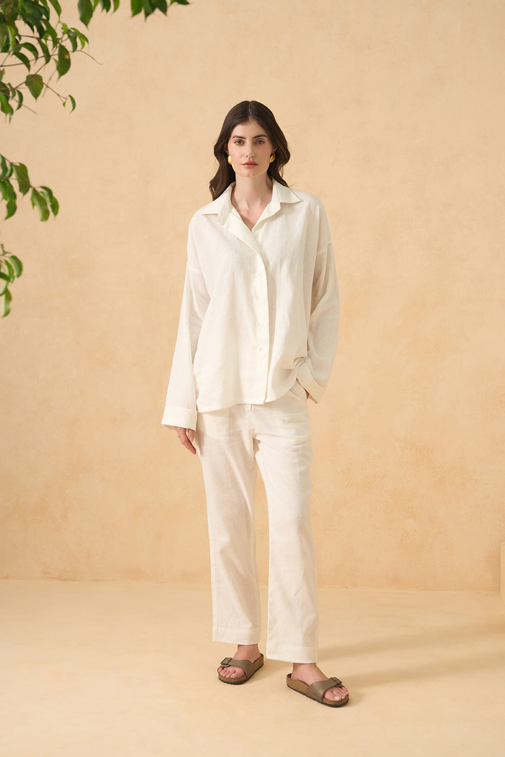 Cut from breezy Linen, the Coconut Veil Co-ord is your go-to for all your wanderings. Oversized, airy and finished with mother-of-pearl buttons, it’s made for balmy days and slow evenings.