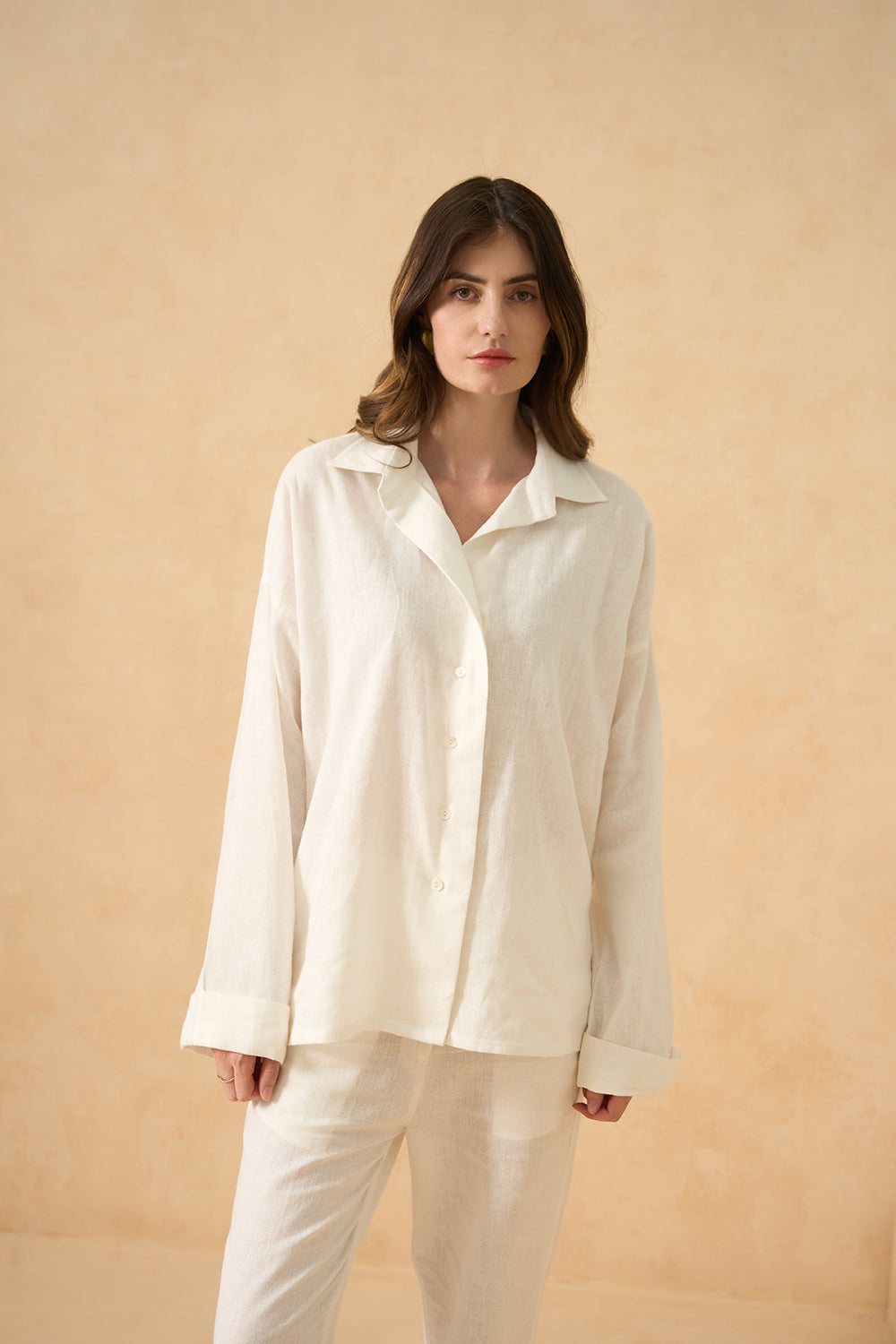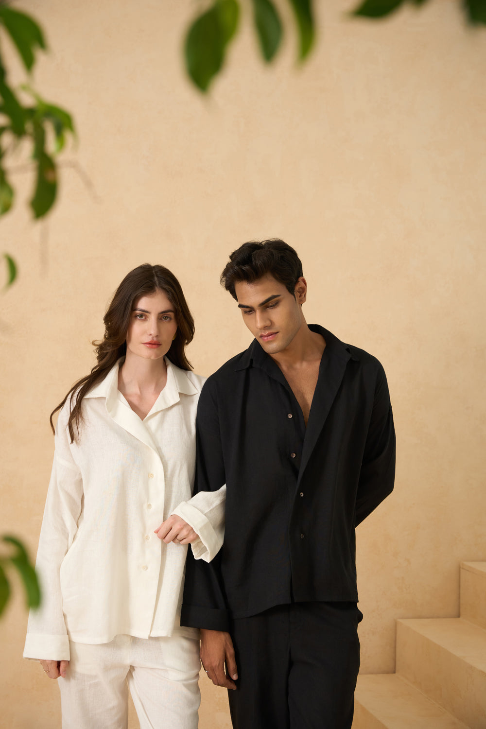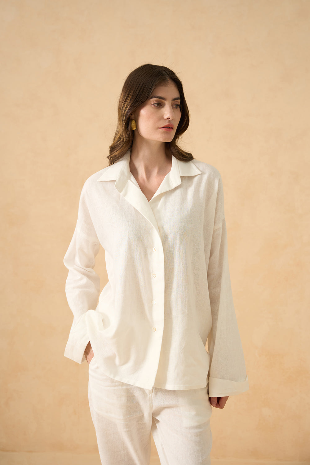 Cut from breezy Linen, the Coconut Veil Co-ord is your go-to for all your wanderings. Oversized, airy and finished with mother-of-pearl buttons, it’s made for balmy days and slow evenings.