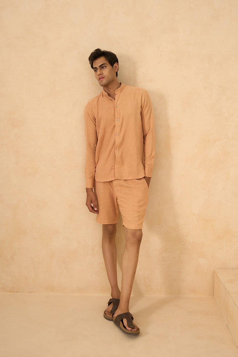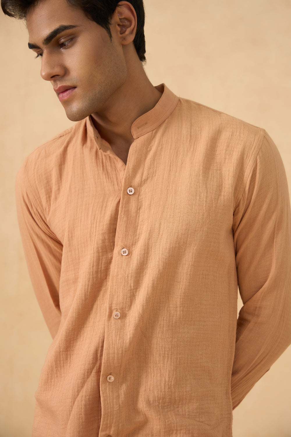 A breezy staple with a band collar and textured soft fabric for quiet, confident style.
