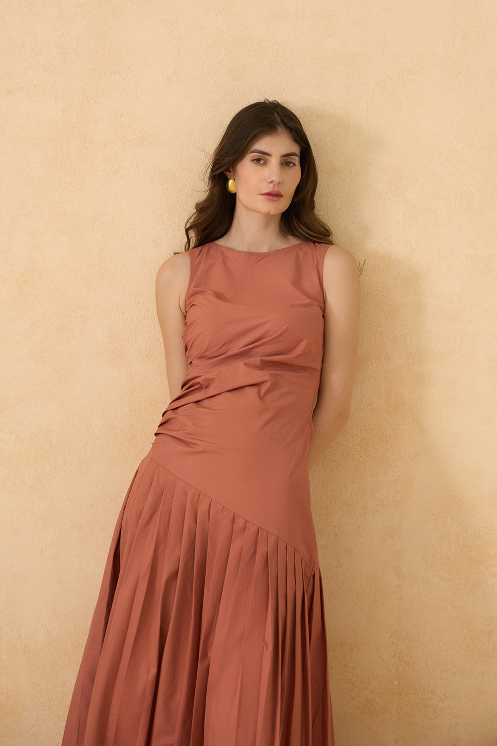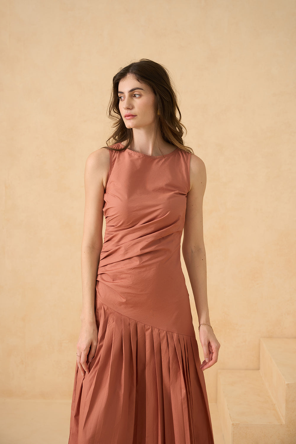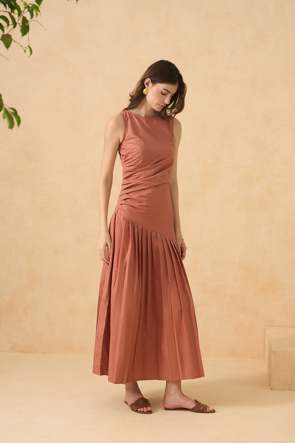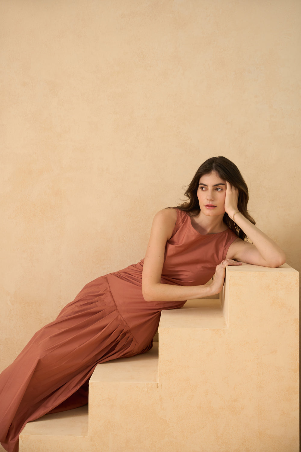 A cotton cowl drape dress with fluid movement—that transitions seamlessly into twilight