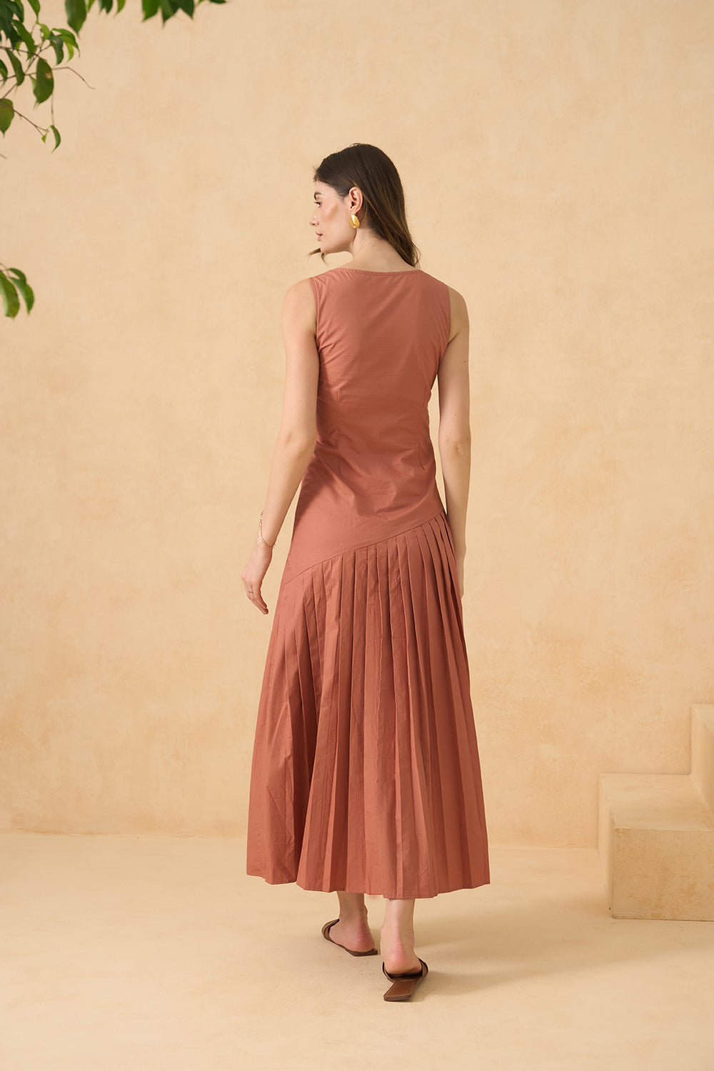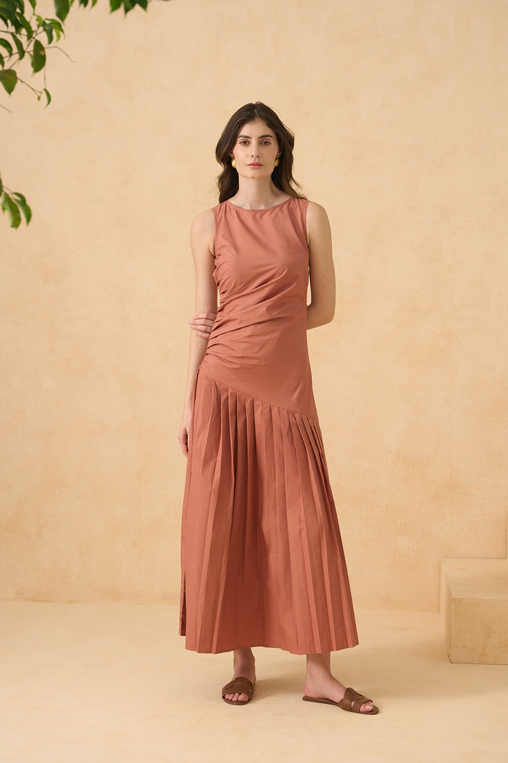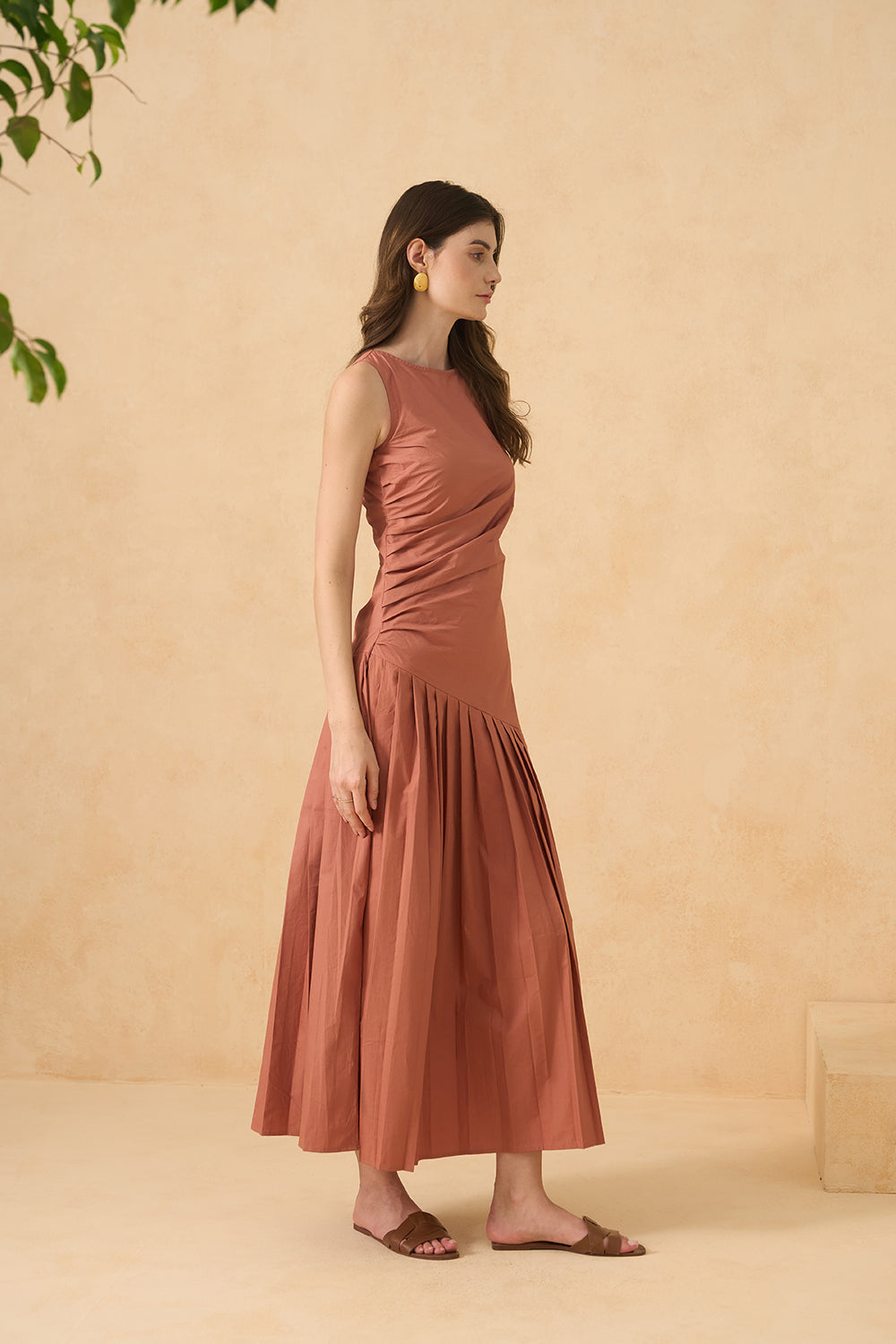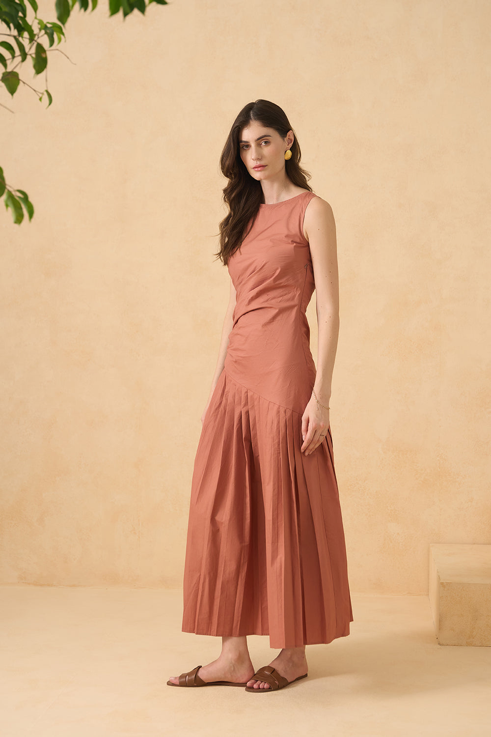 A cotton cowl drape dress with fluid movement—that transitions seamlessly into twilight