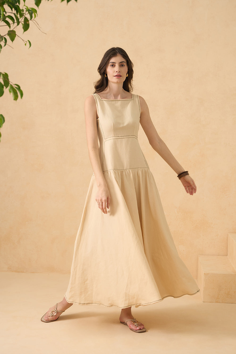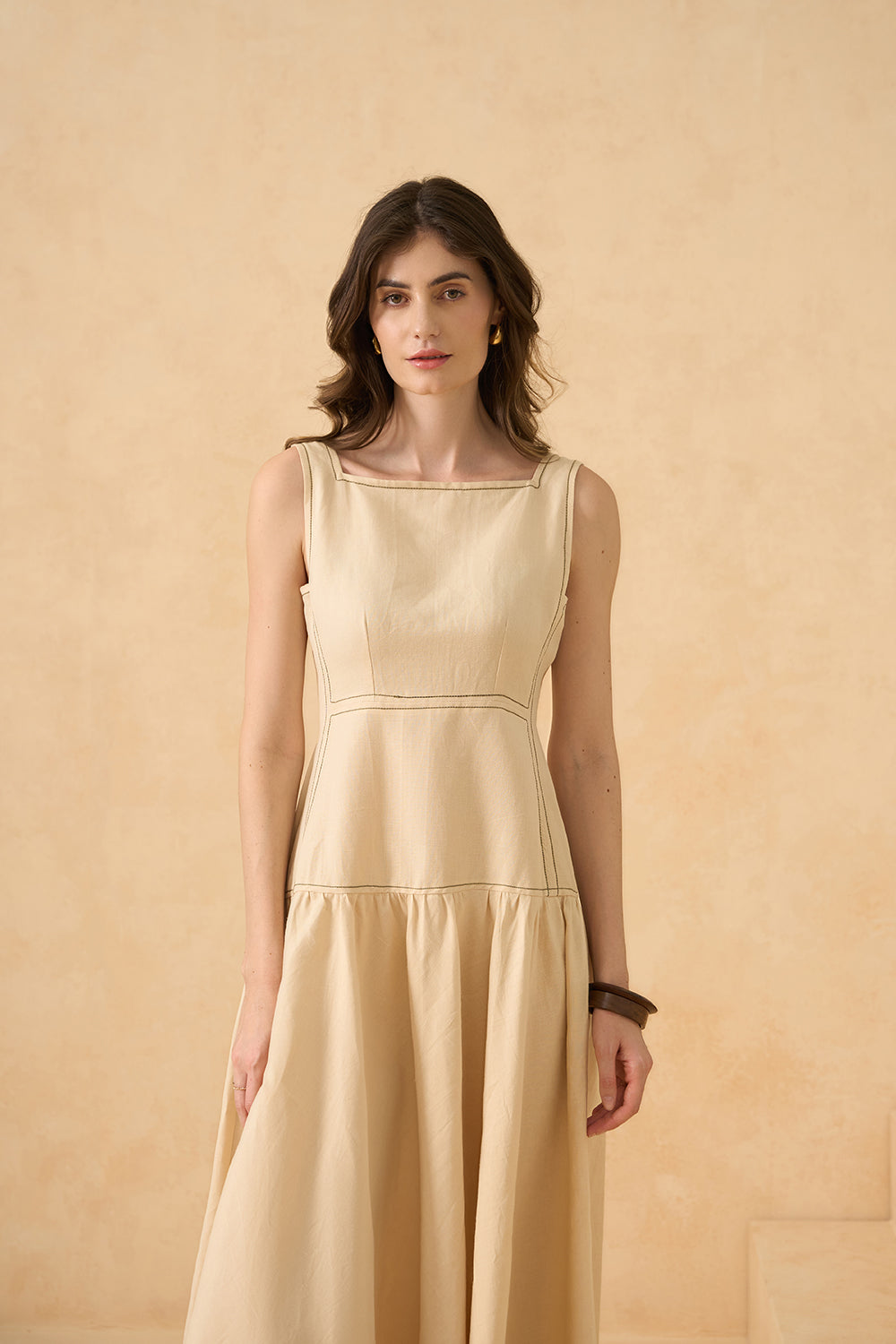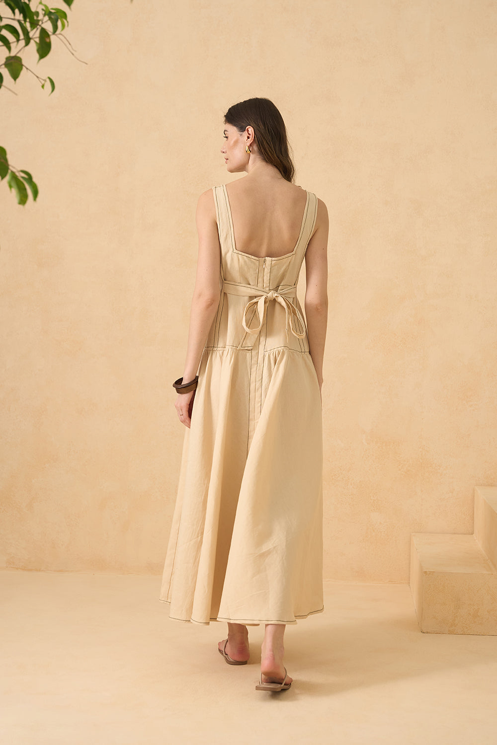 Muted tones and open-back design—this midi dress is elegance with a breeze.