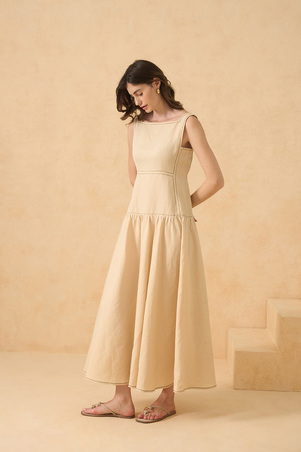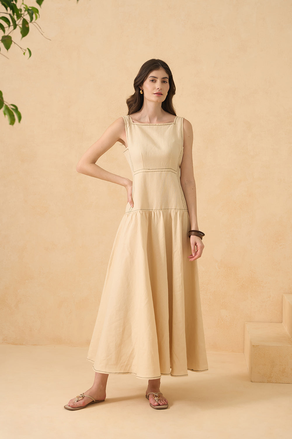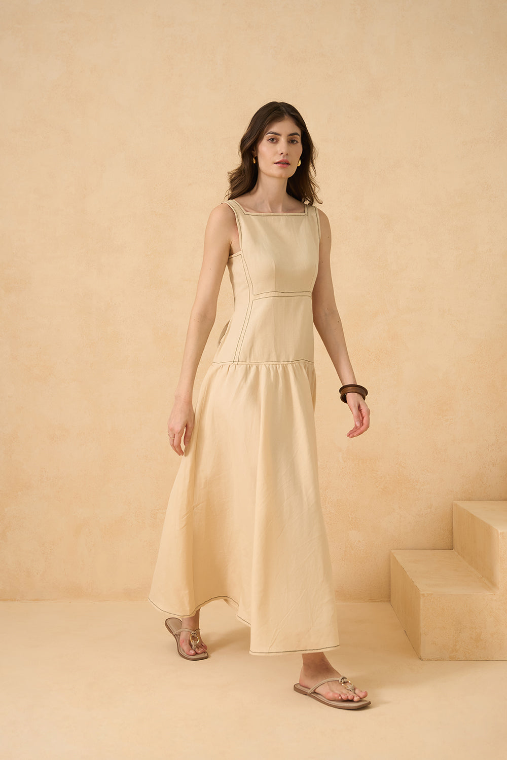 Muted tones and open-back design—this midi dress is elegance with a breeze.