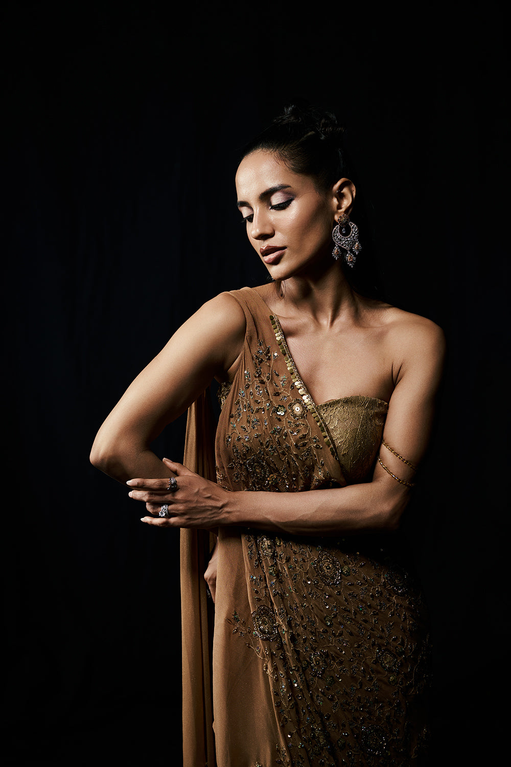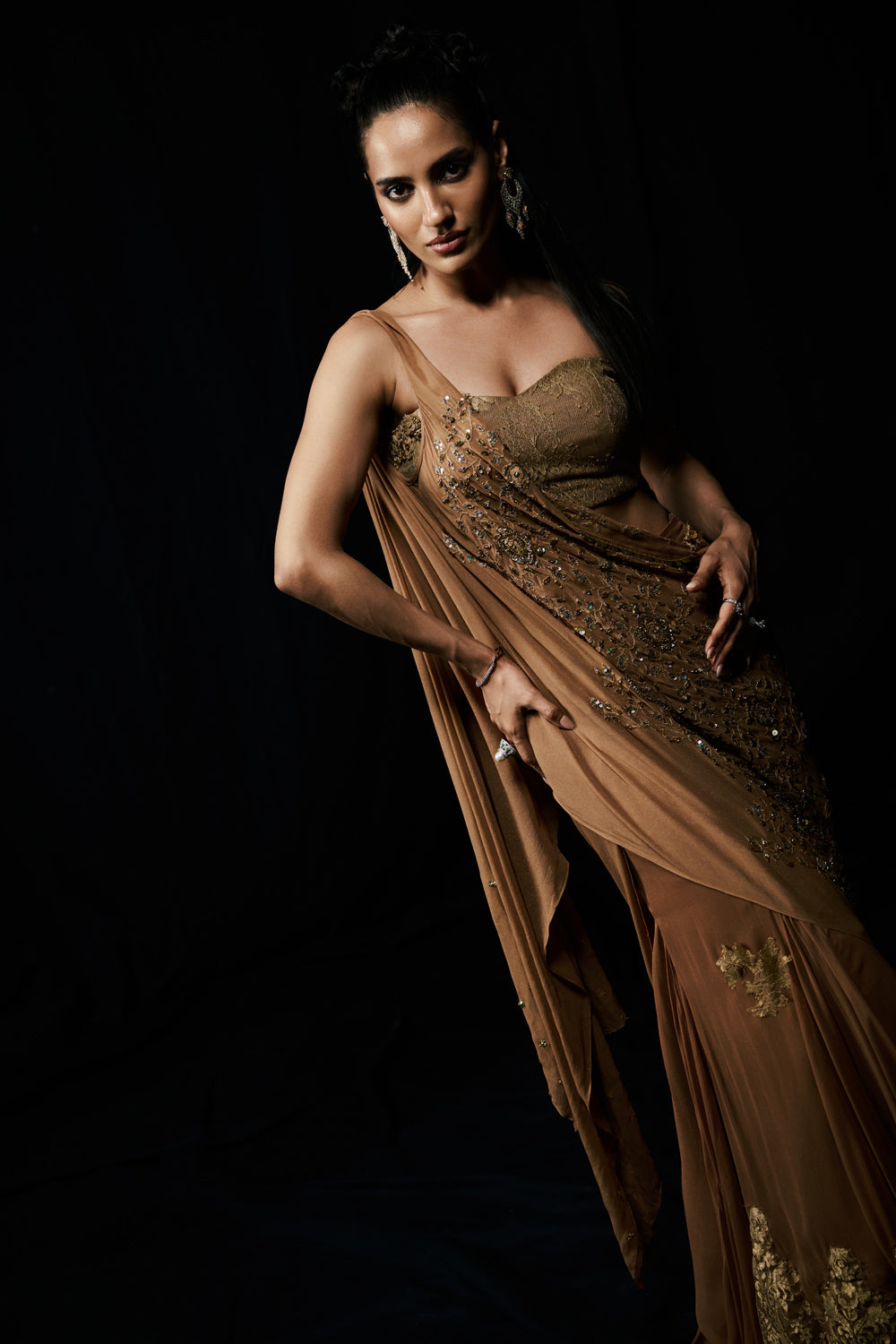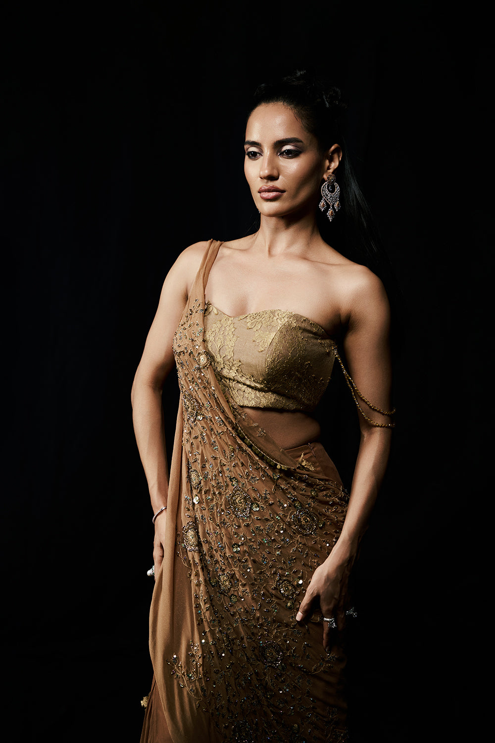Golden Serenade flows like molten light, each fold catching the glow of dusk. A sculpted bustier complements the soft liquid draping, while crystal details glimmer with quiet sophistication. Romantic yet commanding, this piece celebrates femininity at its most radiant.