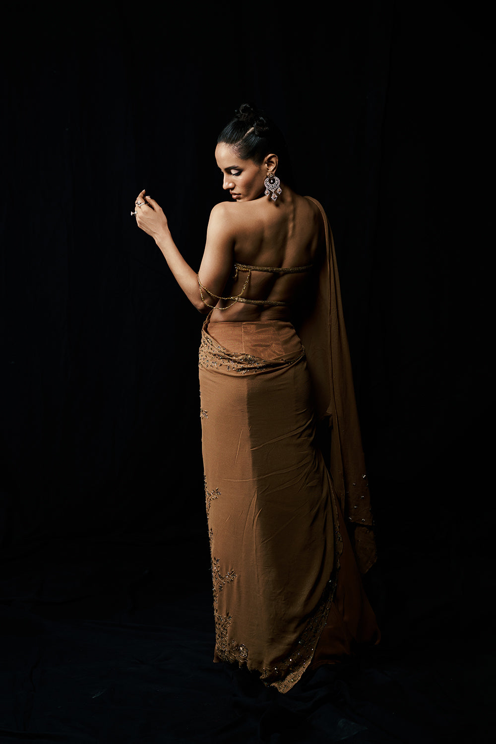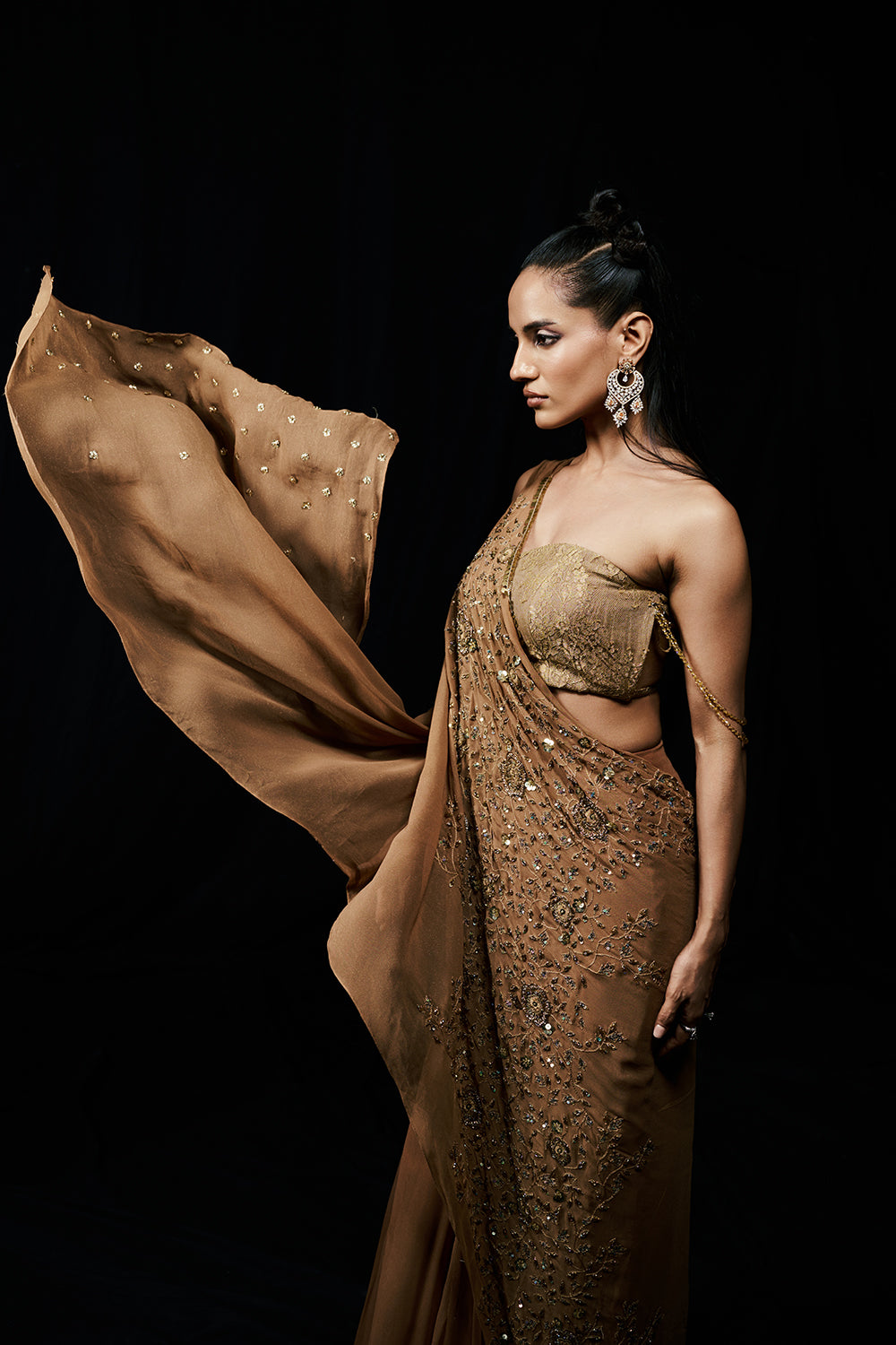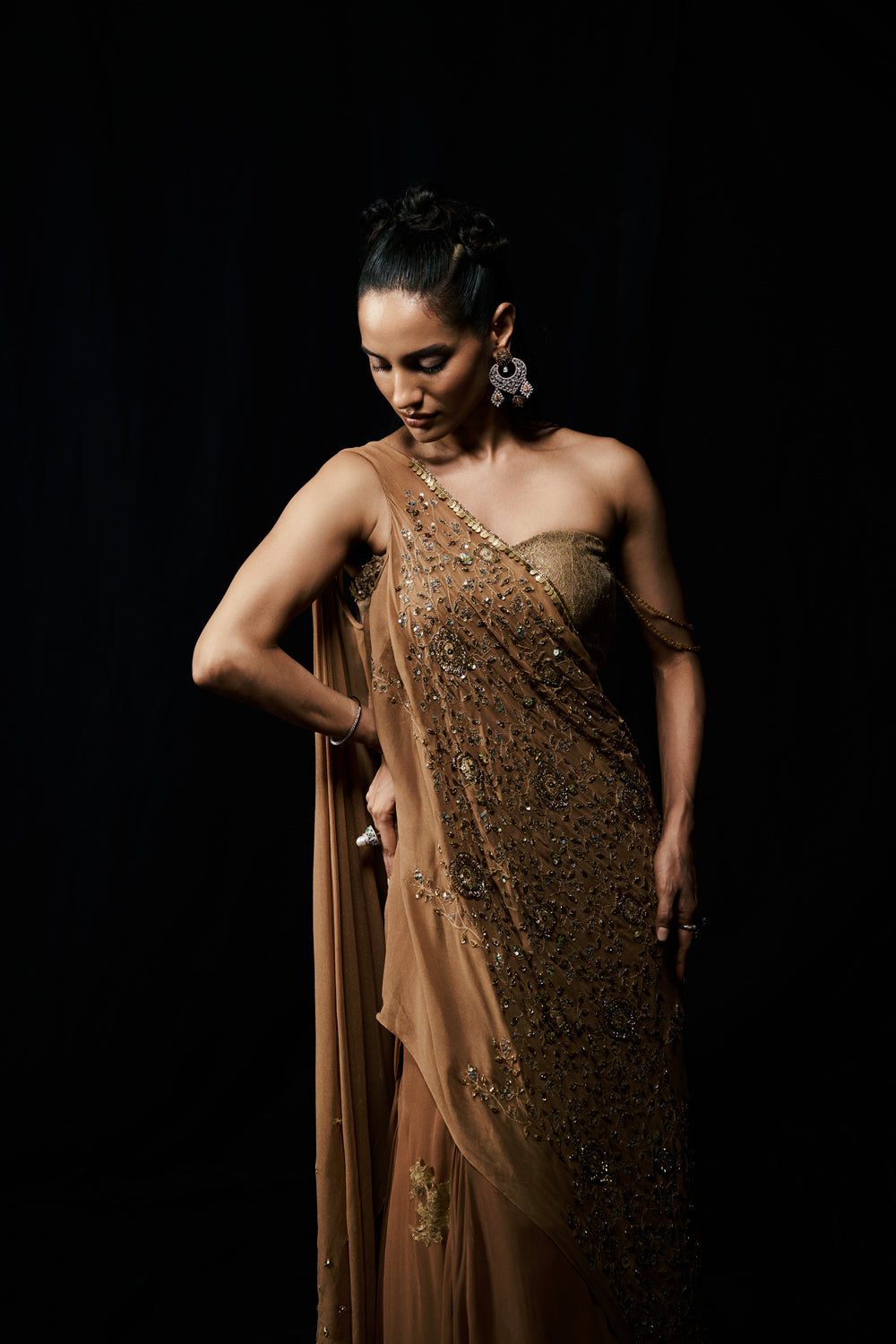 Golden Serenade flows like molten light, each fold catching the glow of dusk. A sculpted bustier complements the soft liquid draping, while crystal details glimmer with quiet sophistication. Romantic yet commanding, this piece celebrates femininity at its most radiant.