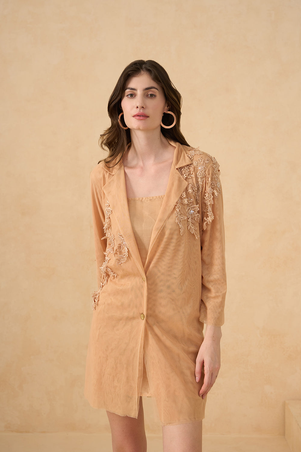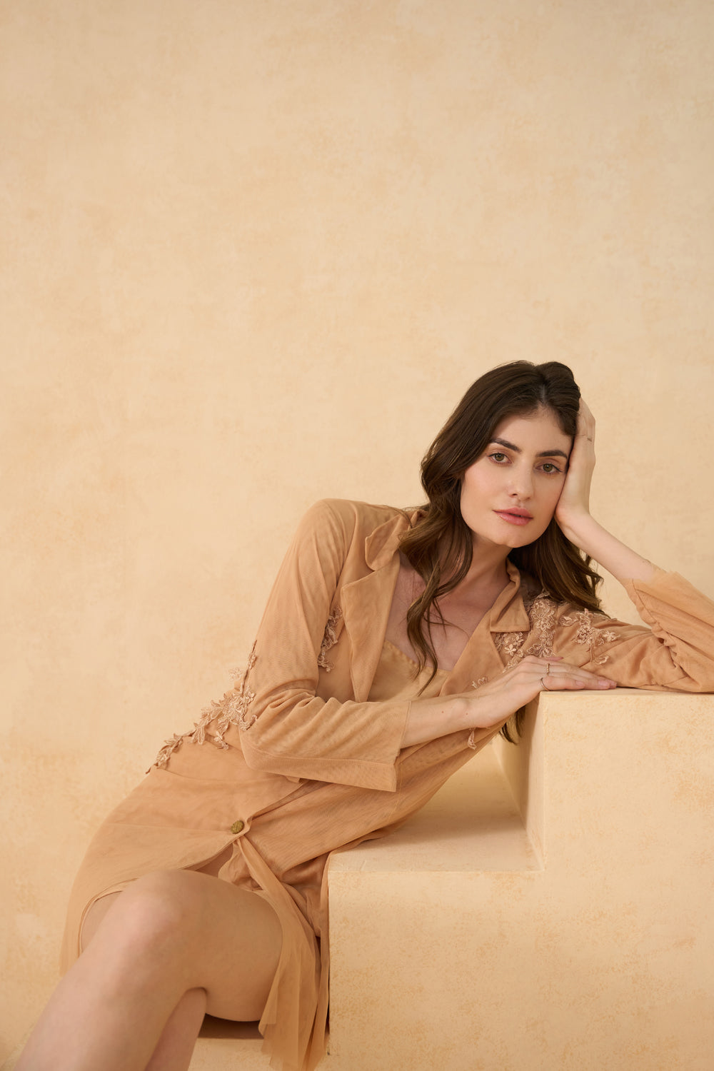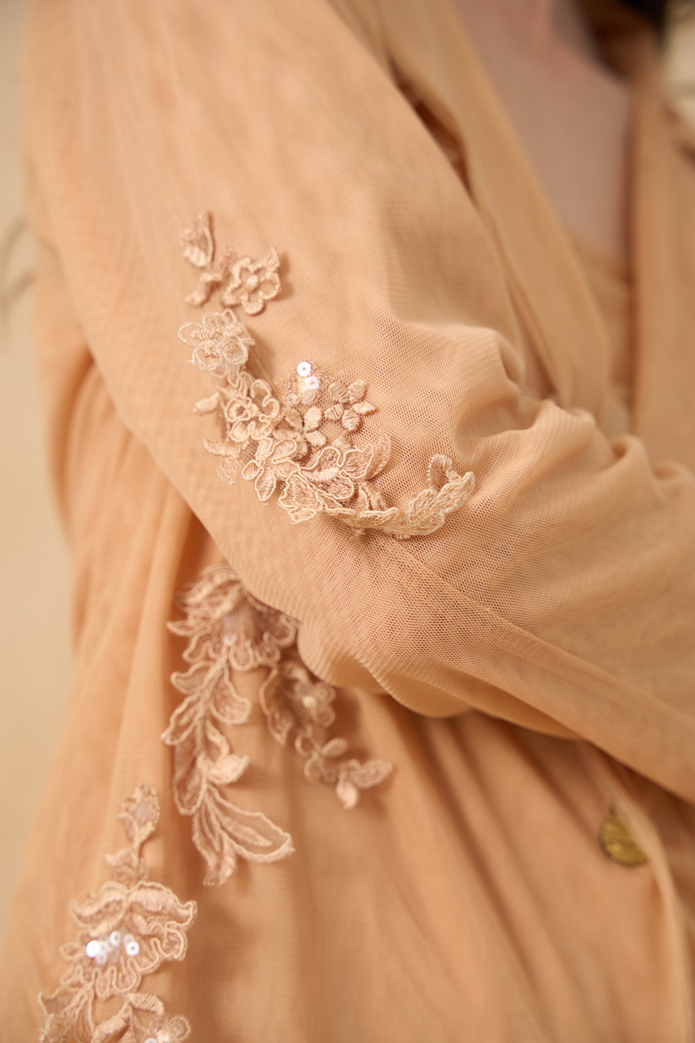 A soft glamour after-glow dress with soft blazer structure and blush tones in our most lightweight silhouette