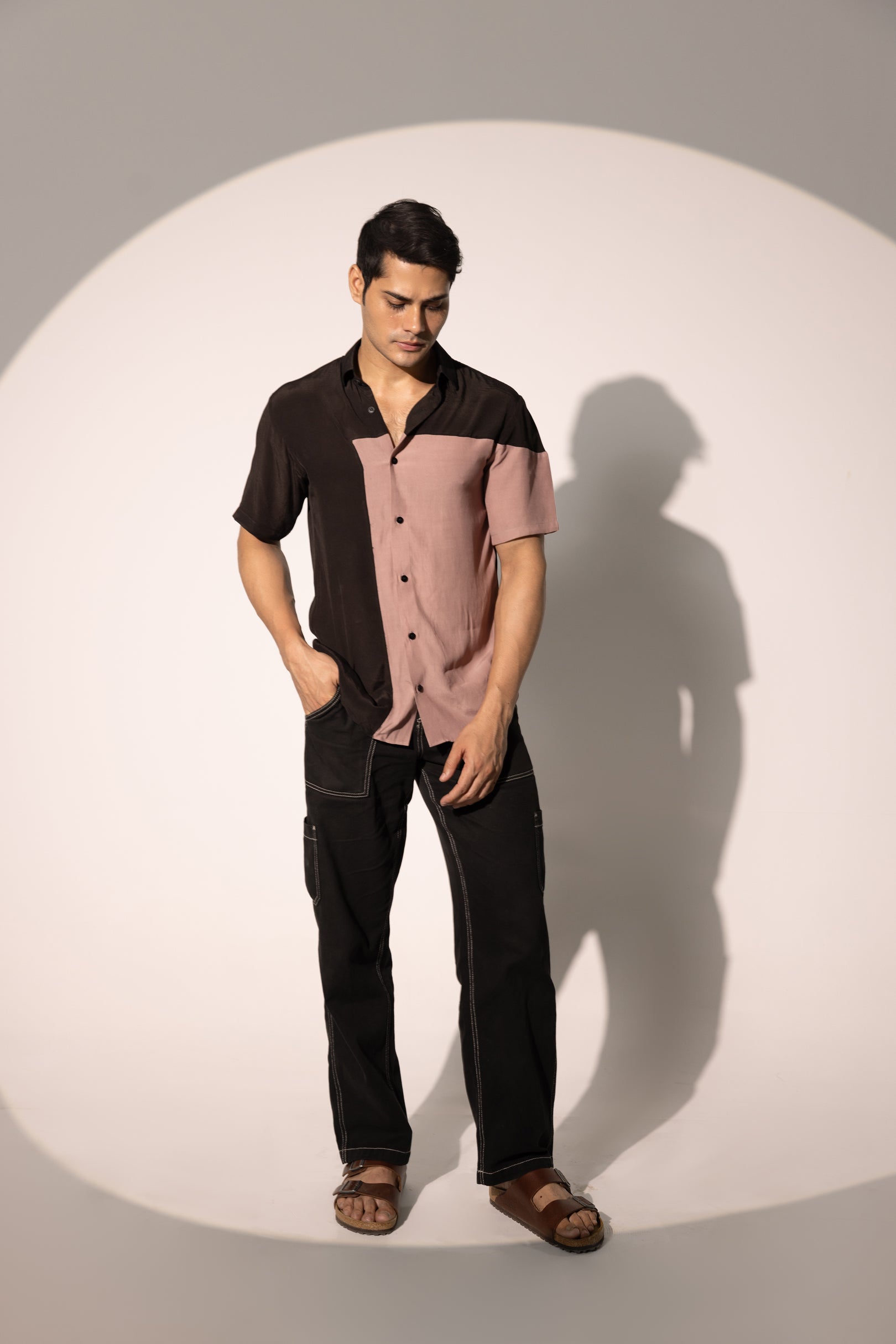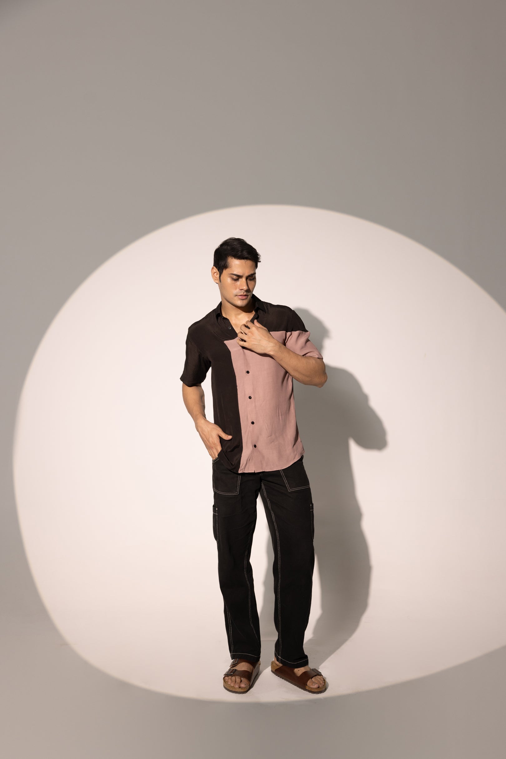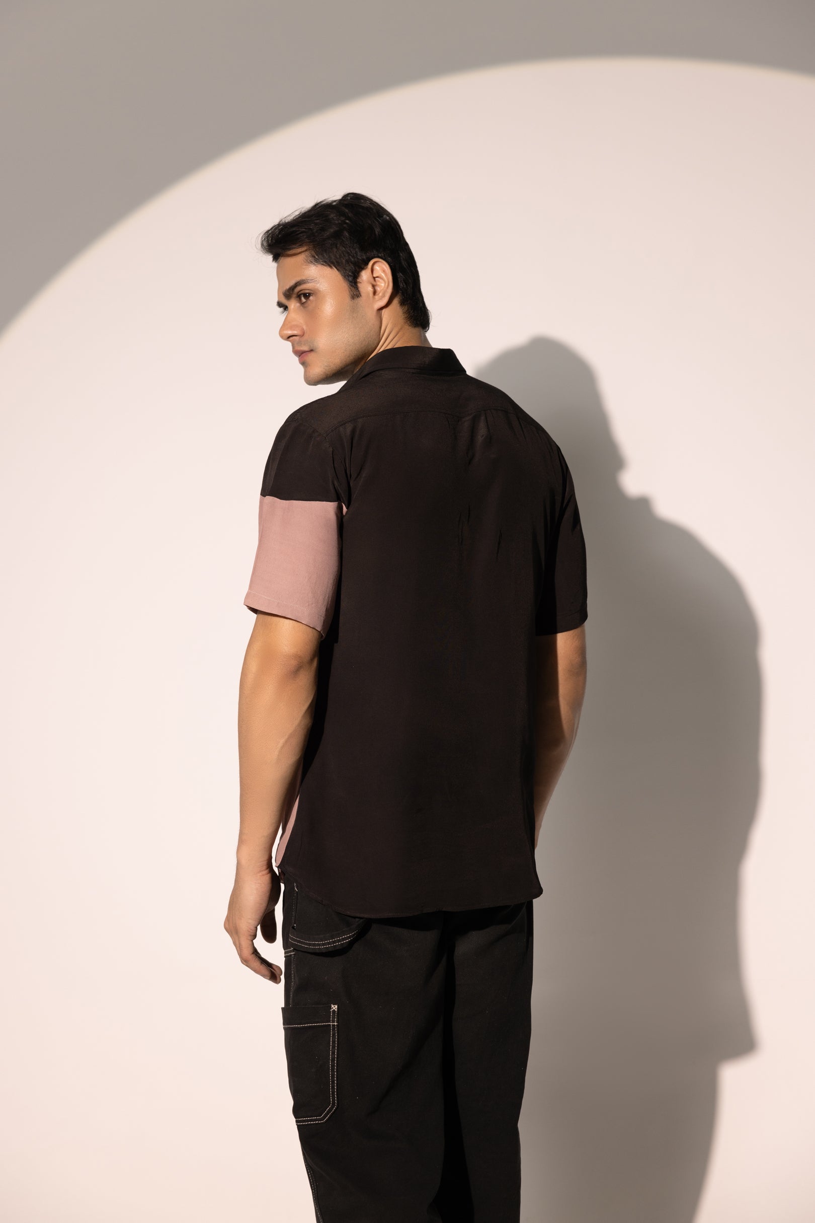 Make a bold impact with our black and pink color-block shirt. The contrasting hues add a dynamic and vibrant touch to your outfit.