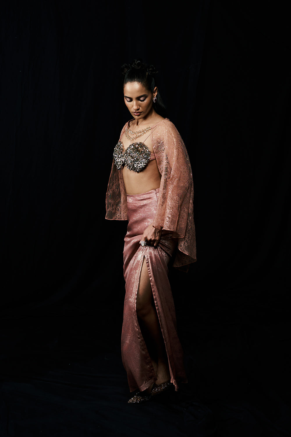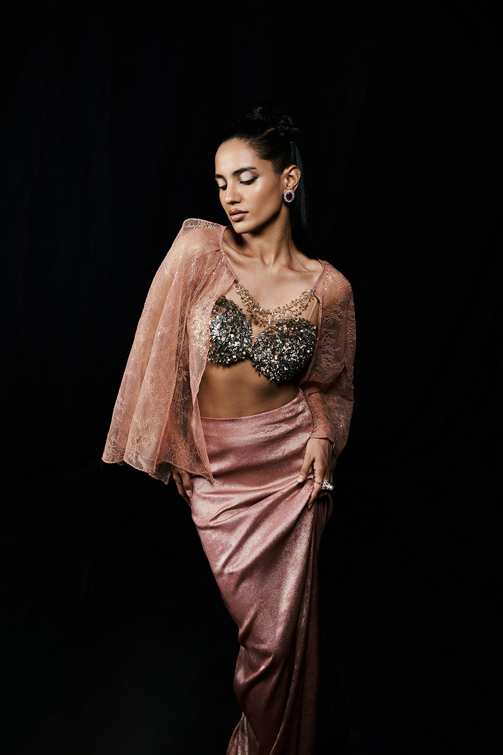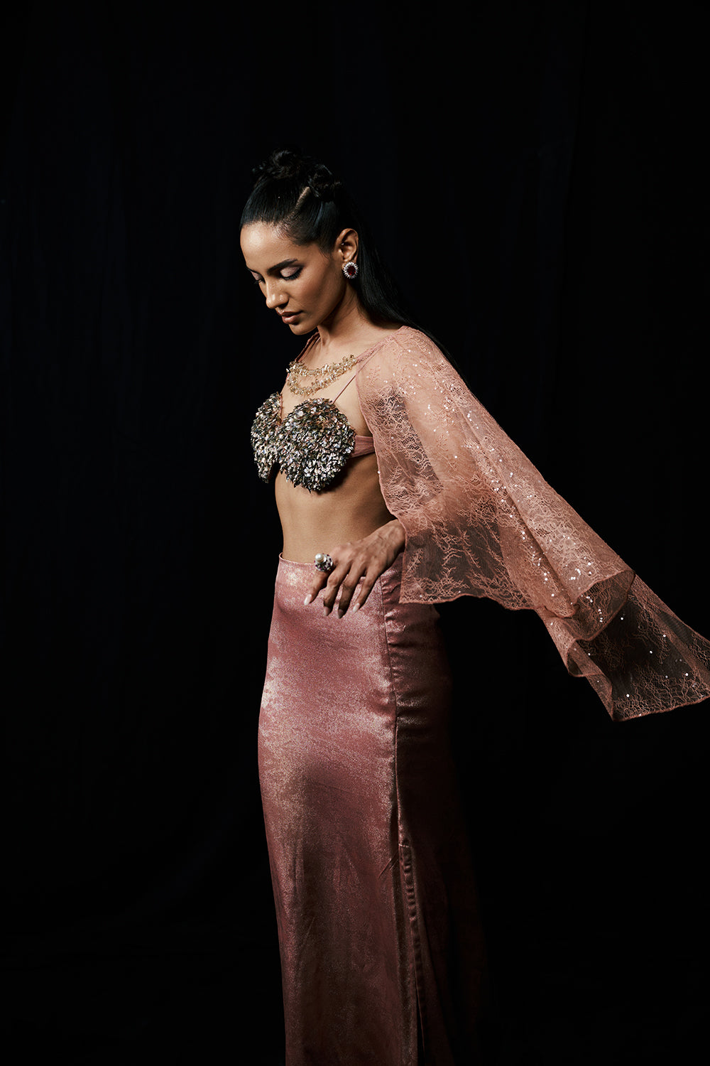 In midnight tones and plush textures, Nocturne Drape is crafted for the woman who thrives in the after-hours. Luxurious velvet meets liquid satin draping, held together with an accent chain that doesn’t confine—it liberates. Dark, opulent, and magnetic.