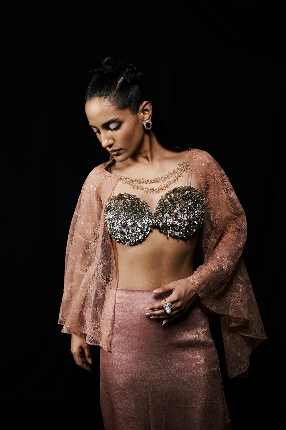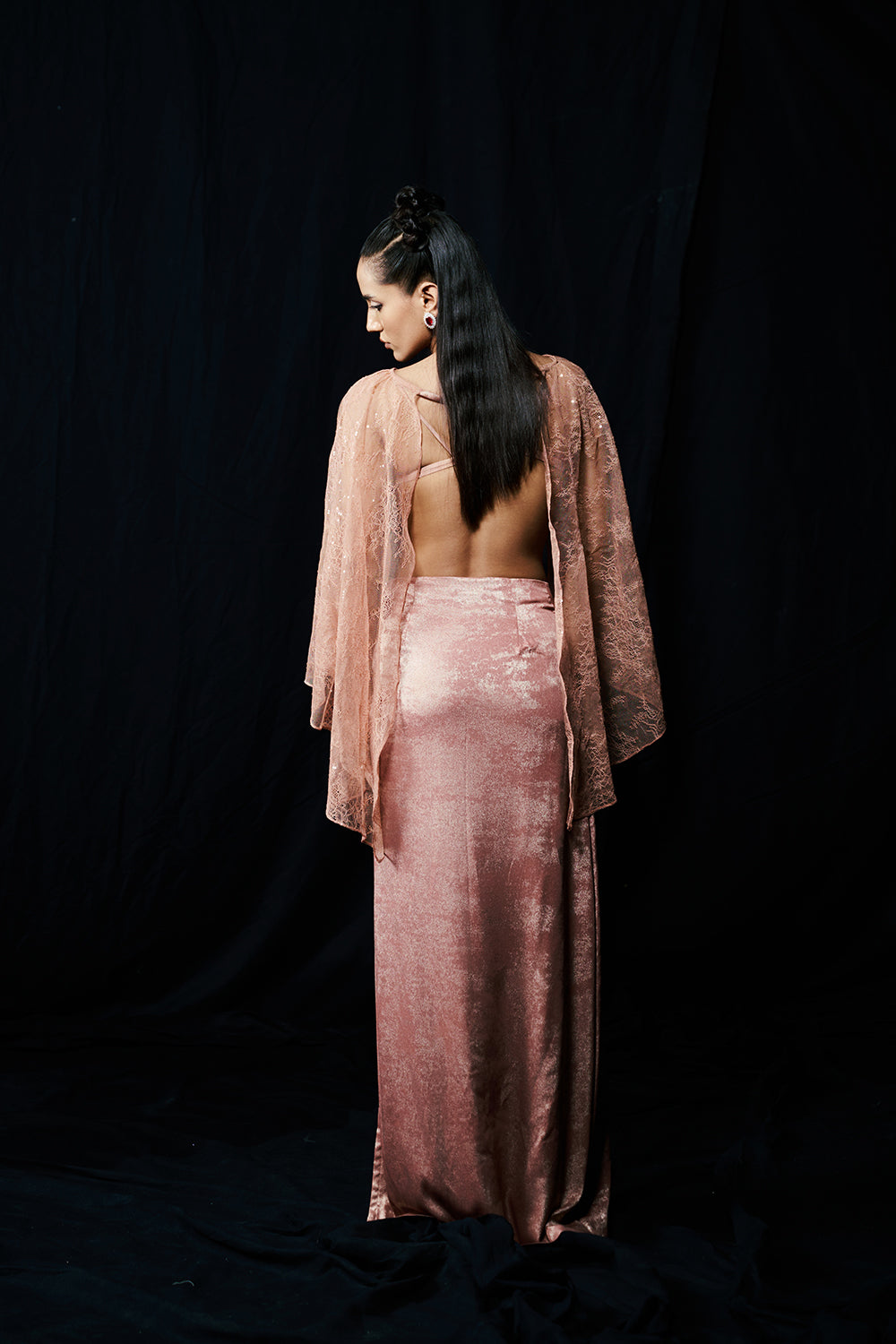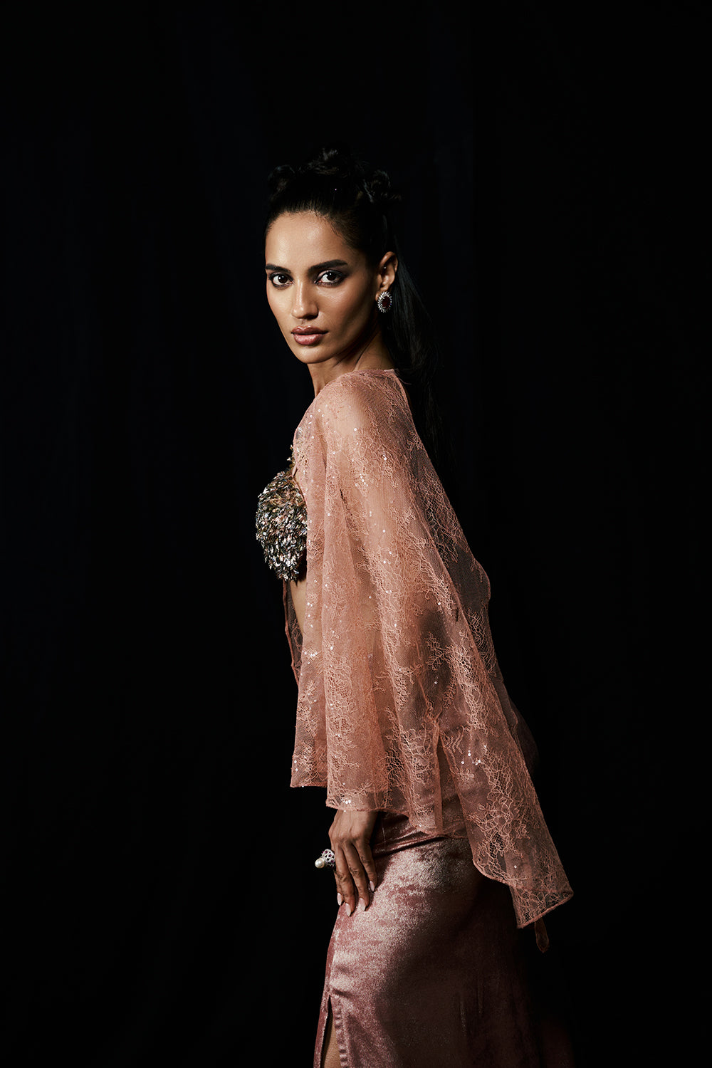 In midnight tones and plush textures, Nocturne Drape is crafted for the woman who thrives in the after-hours. Luxurious velvet meets liquid satin draping, held together with an accent chain that doesn’t confine—it liberates. Dark, opulent, and magnetic.