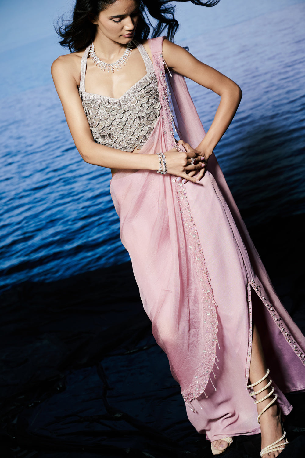 Softness with an edge — Blush Inferno Drape pairs a sheer blush saree with a sculpted rosette blouse hand-embellished in silver. A slit-lined drape adds movement and sensuality, while delicate crystal borders shimmer with quiet provocation. This piece redefines romance, making it bold, unapologetic, and unafraid to be seen.