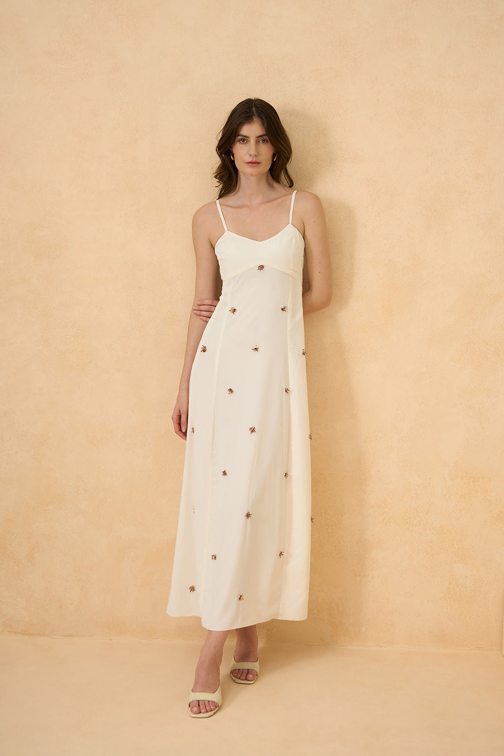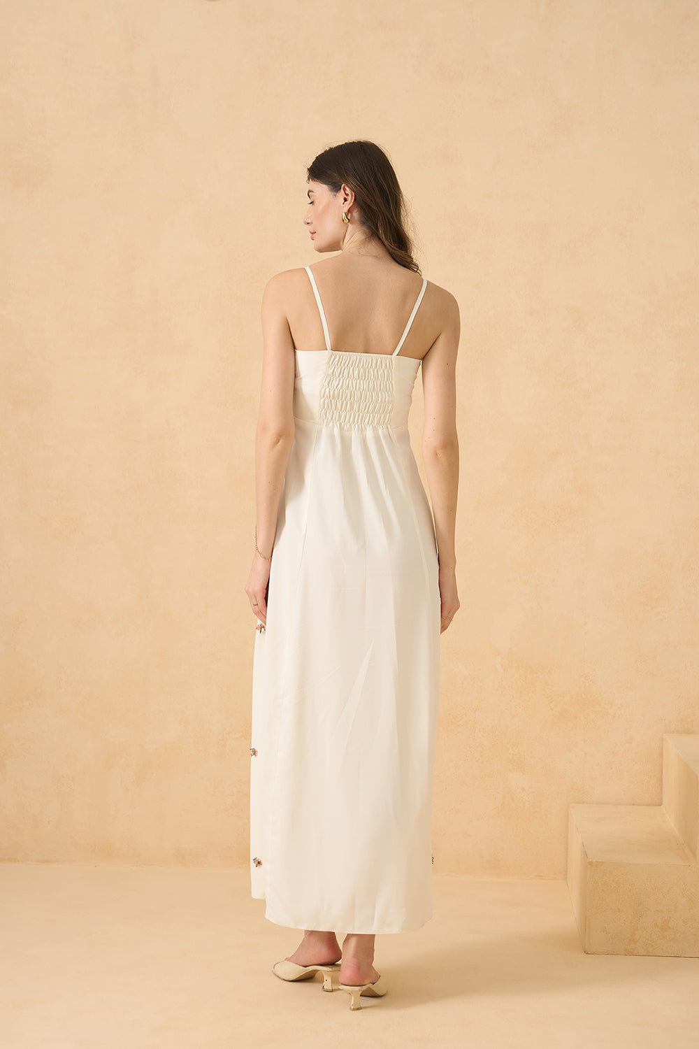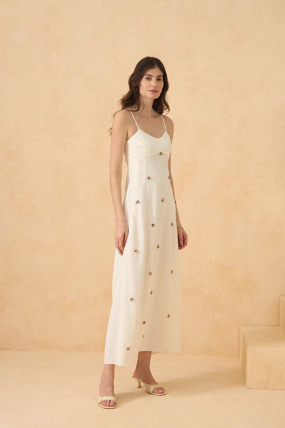 Flirty, clean, and featherlight—a minimal maxi that pairs beautifully with sun-kissed skin