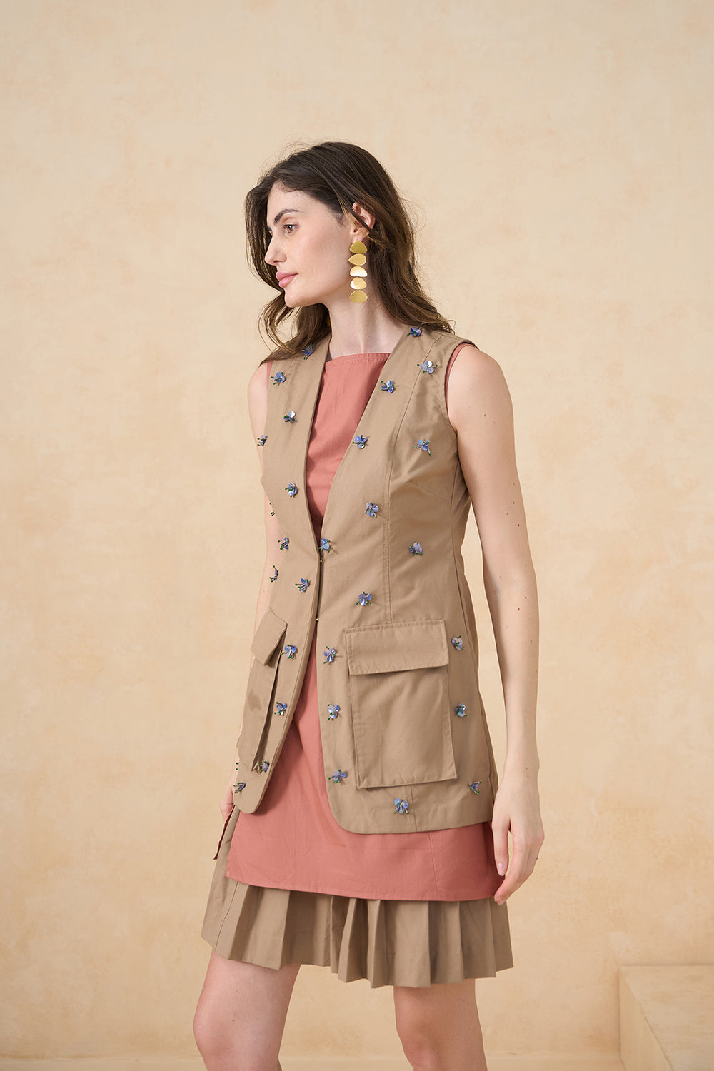 Structured yet airy, this sleeveless dress brings balance to summer’s warmth with earthy elegance