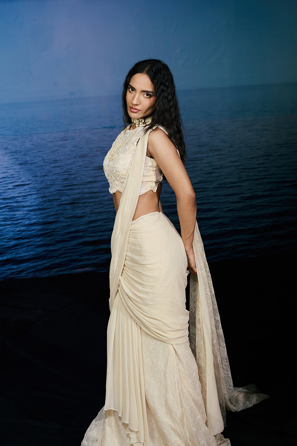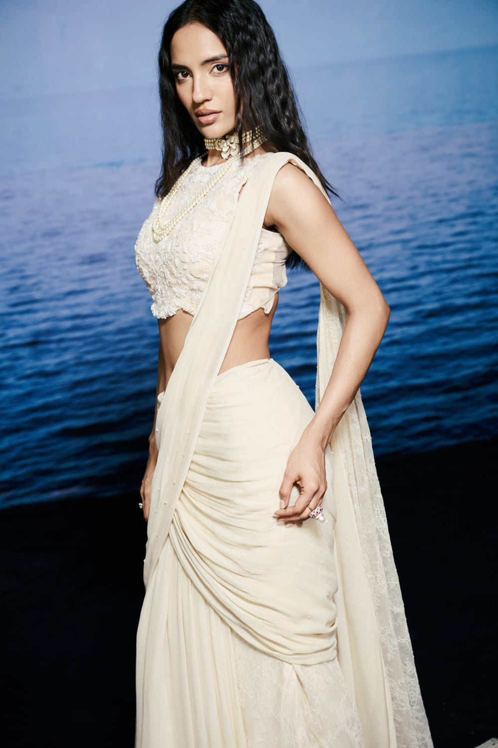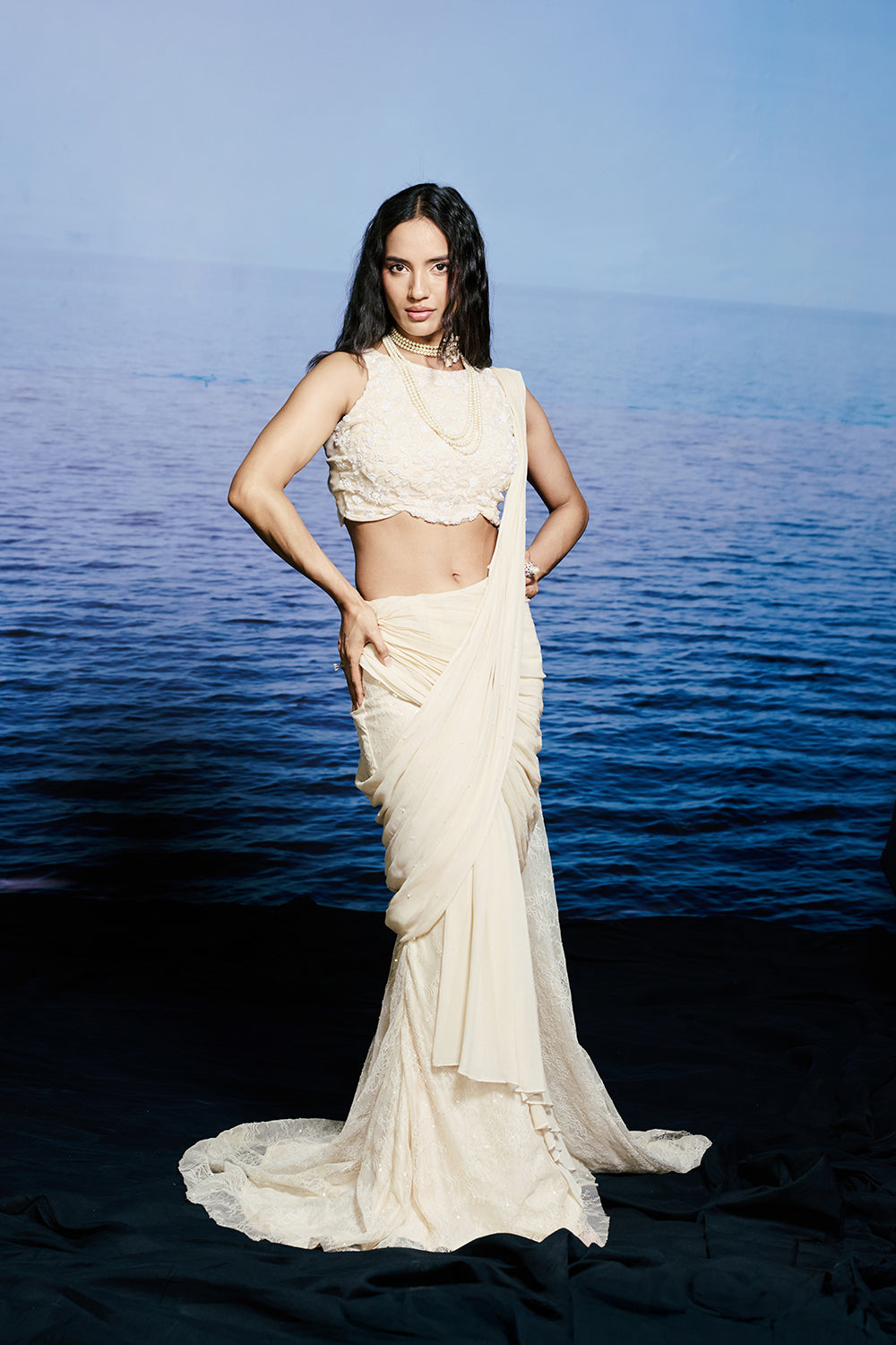 The Adagio Drape Set embodies the art of slow, deliberate movement. Its structured, beaded winged blouse with intricate embroidery provides a bold combination of tradition and modern allure, while the flowing, A-line skirt cascades with a serene grace. This piece is about finding your own rhythm and moving through the world with unhurried confidence.