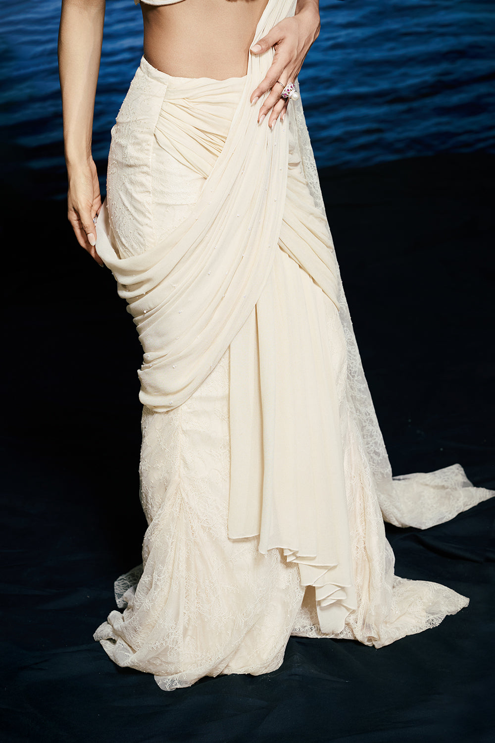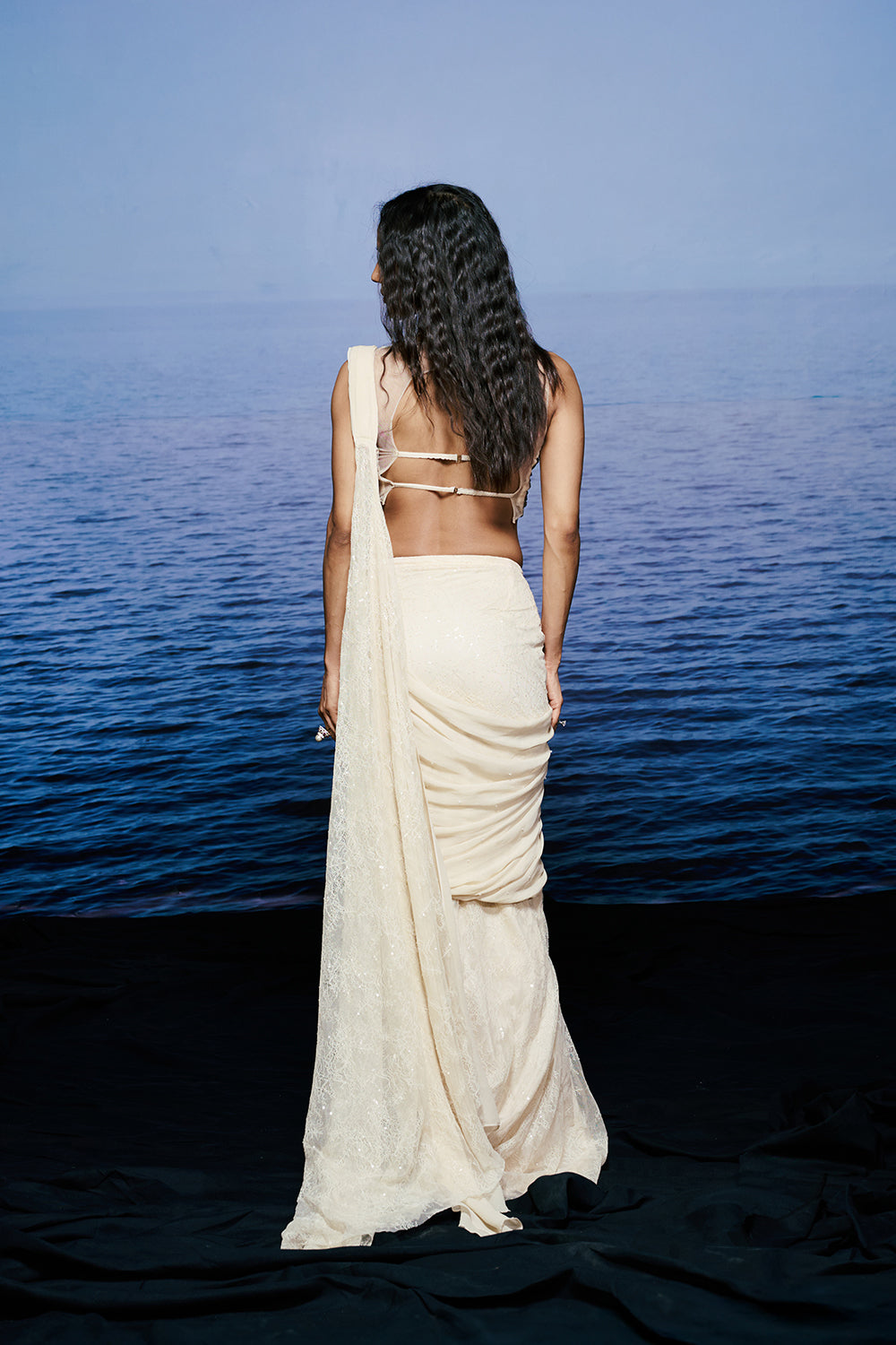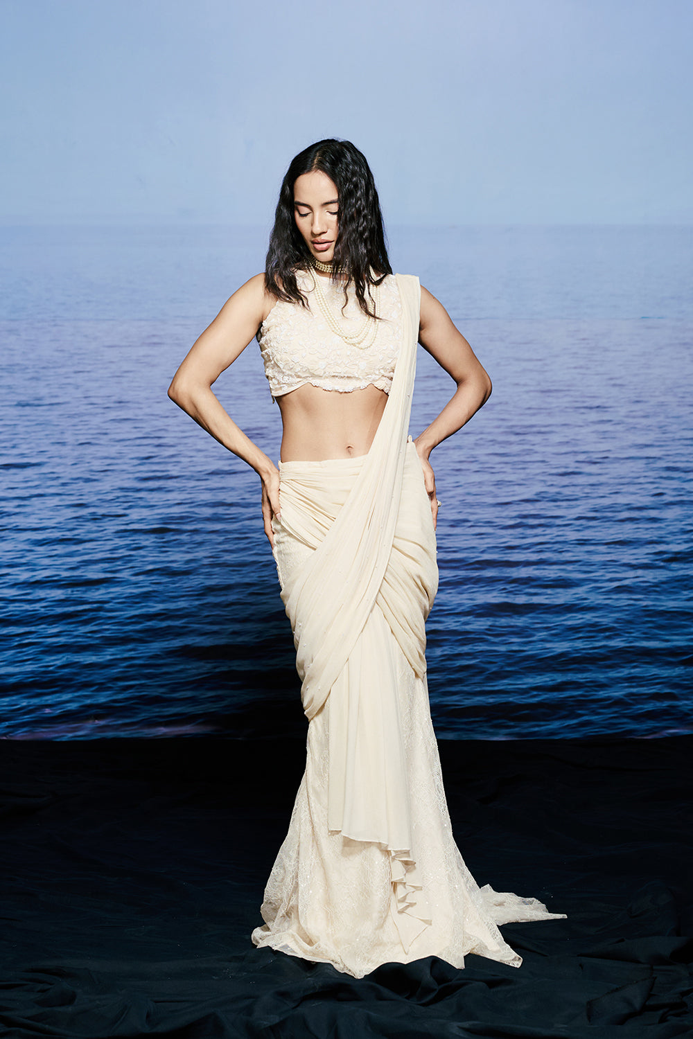 The Adagio Drape Set embodies the art of slow, deliberate movement. Its structured, beaded winged blouse with intricate embroidery provides a bold combination of tradition and modern allure, while the flowing, A-line skirt cascades with a serene grace. This piece is about finding your own rhythm and moving through the world with unhurried confidence.