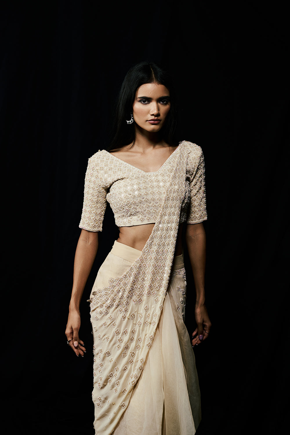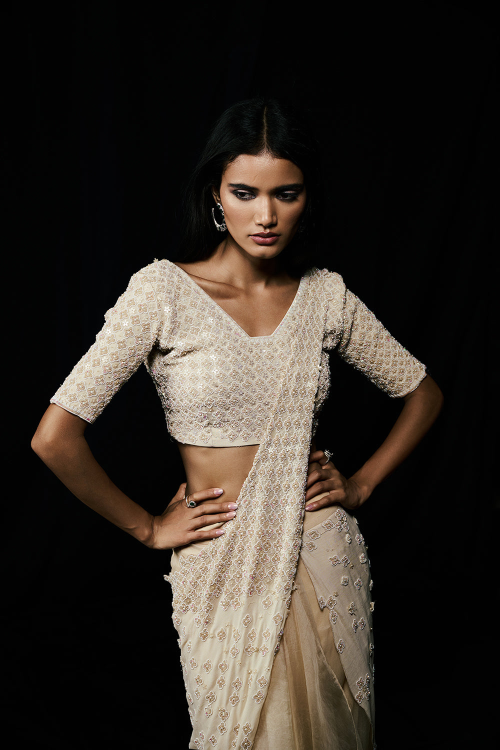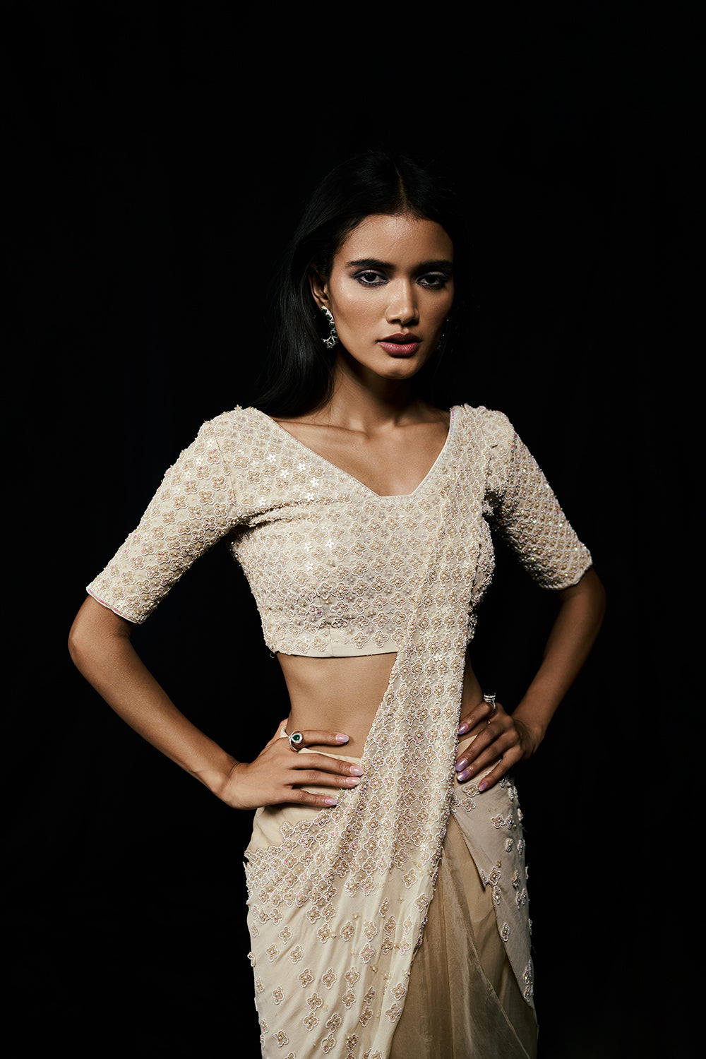 An homage to timeless grace, the Aura Saree embodies pure sophistication. The softly draped skirt melts into a beautifully structured, hand-embroidered blouse with a classic V-neckline. The full-length sleeves are delicately detailed with intricate beadwork, creating a look that is both refined and powerful. This is for the woman who finds her strength in quiet confidence.