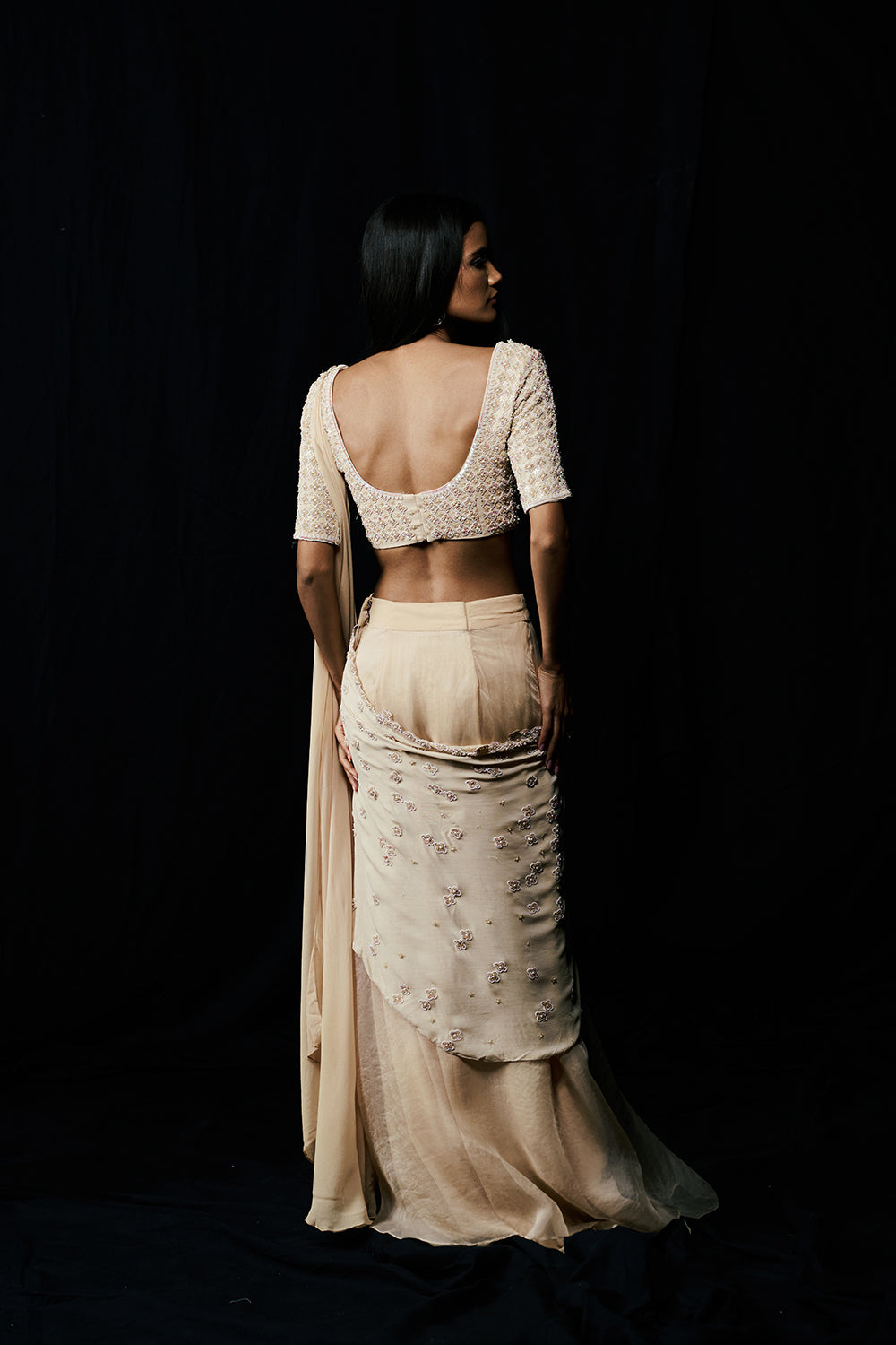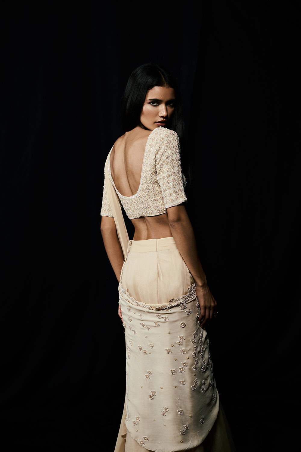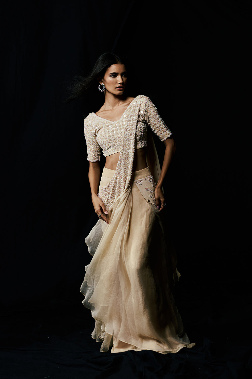 An homage to timeless grace, the Aura Saree embodies pure sophistication. The softly draped skirt melts into a beautifully structured, hand-embroidered blouse with a classic V-neckline. The full-length sleeves are delicately detailed with intricate beadwork, creating a look that is both refined and powerful. This is for the woman who finds her strength in quiet confidence.