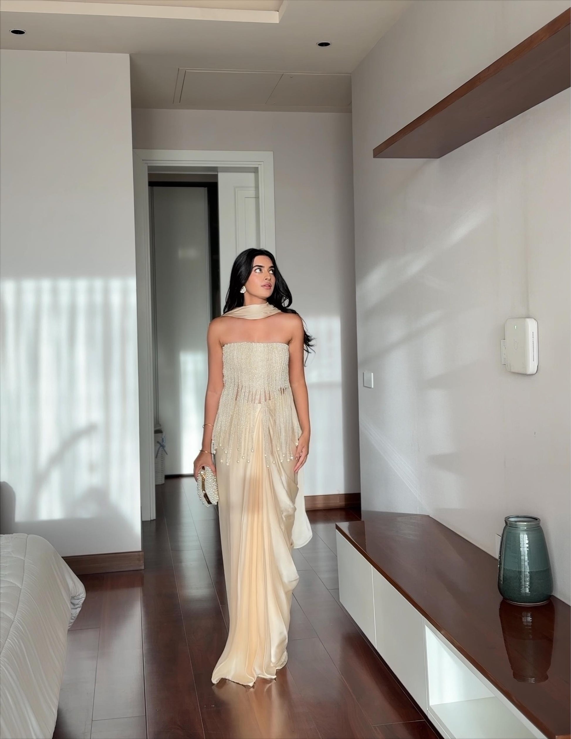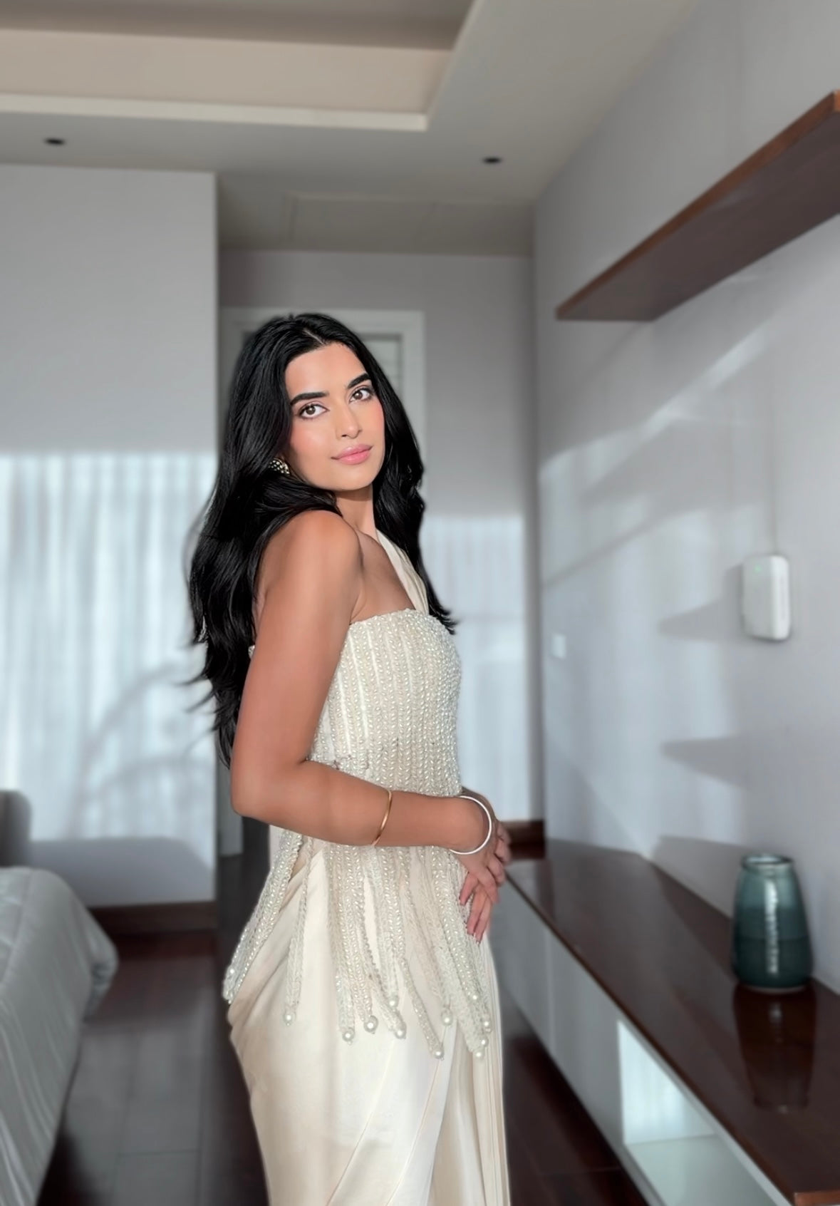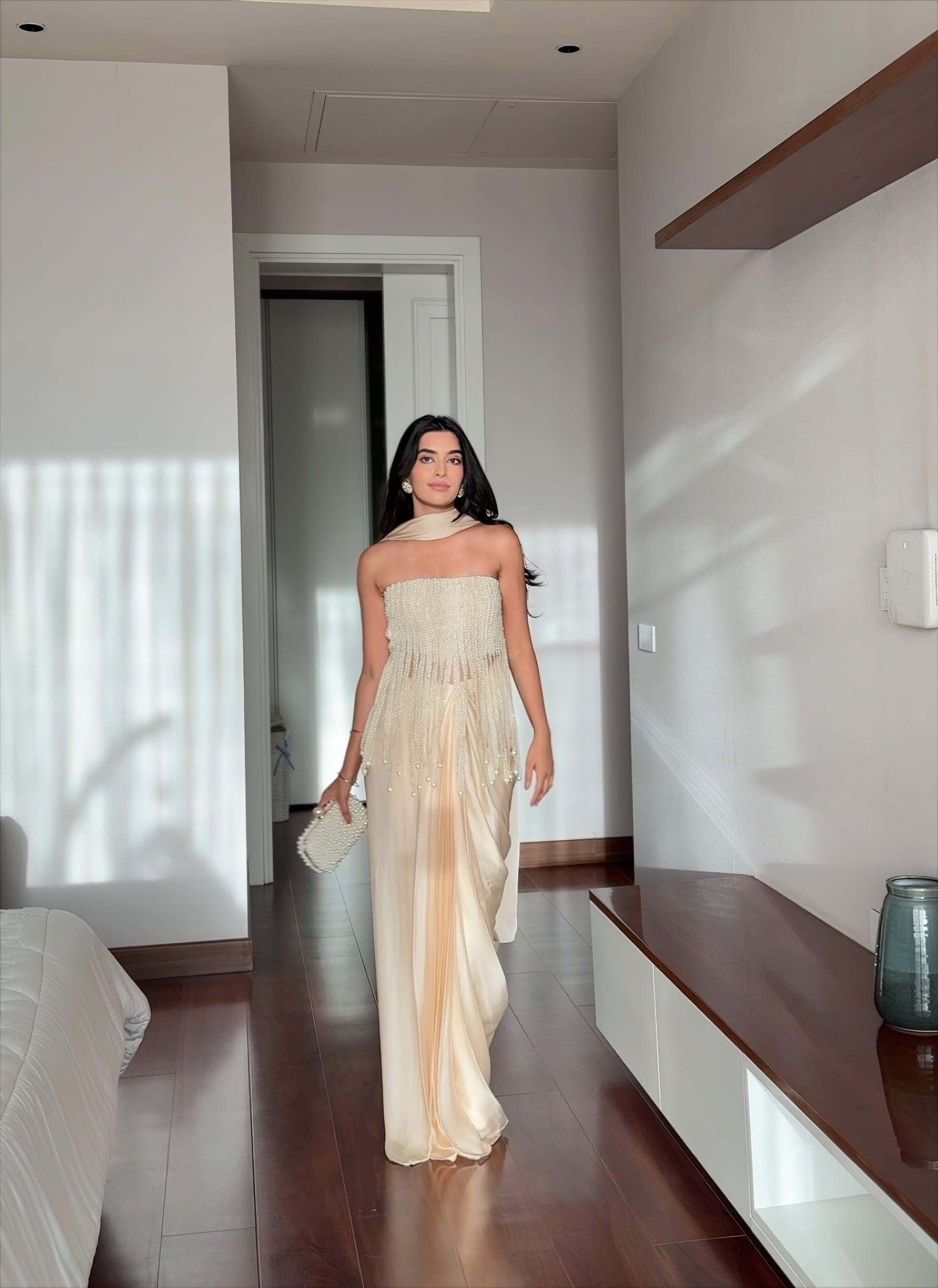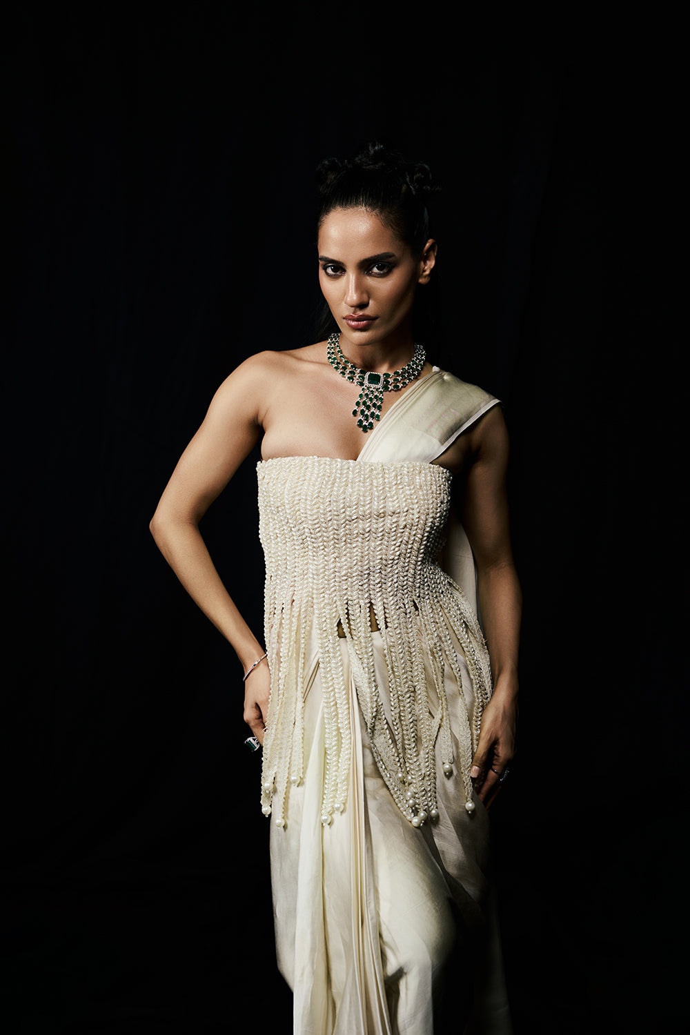 The Cascade Blouse Drape Set is a masterpiece of fluid motion. A unique off-shoulder blouse is adorned with exquisite fringe that dances with every step. The simple drape of the saree allows the intricate top to take center stage, creating a look that is sophisticated and completely unforgettable.