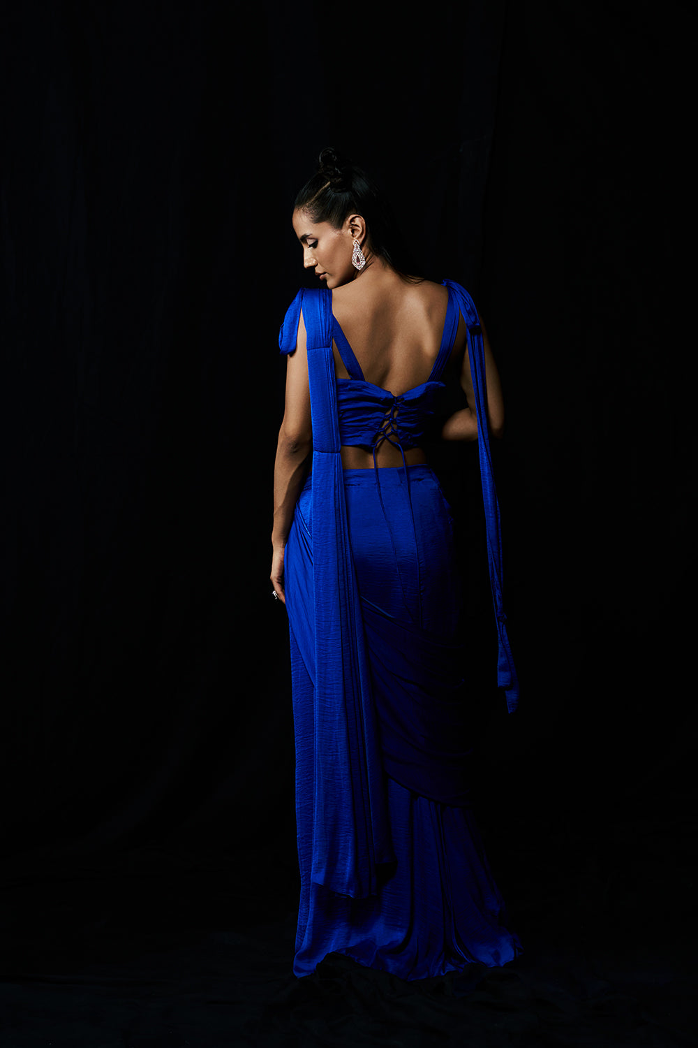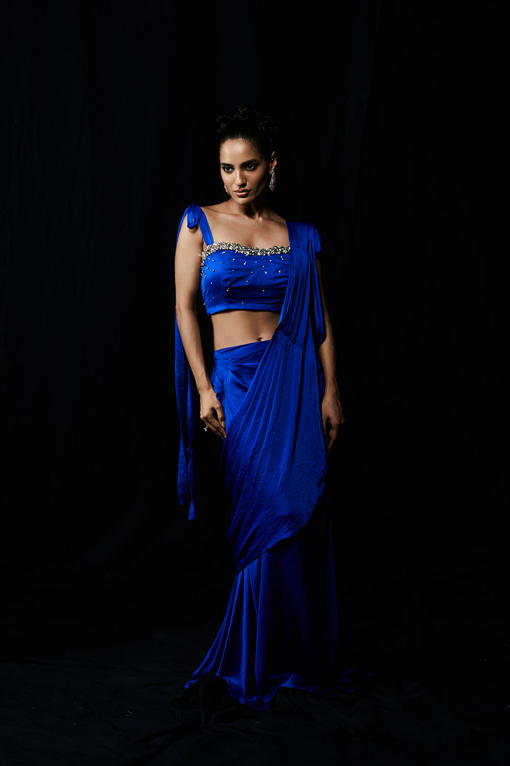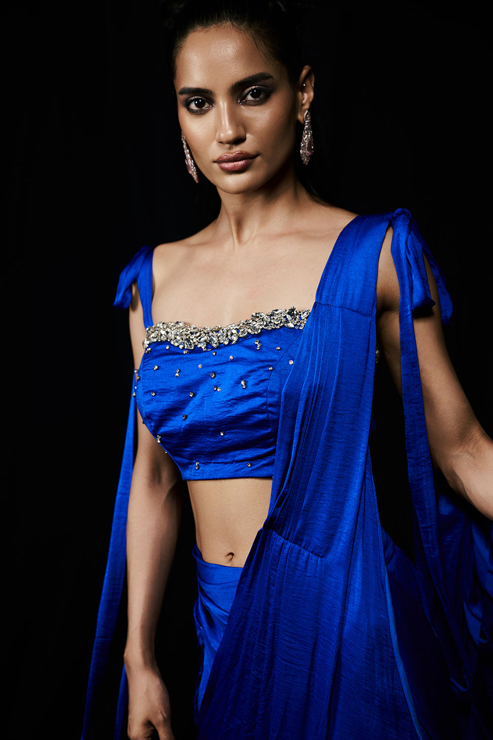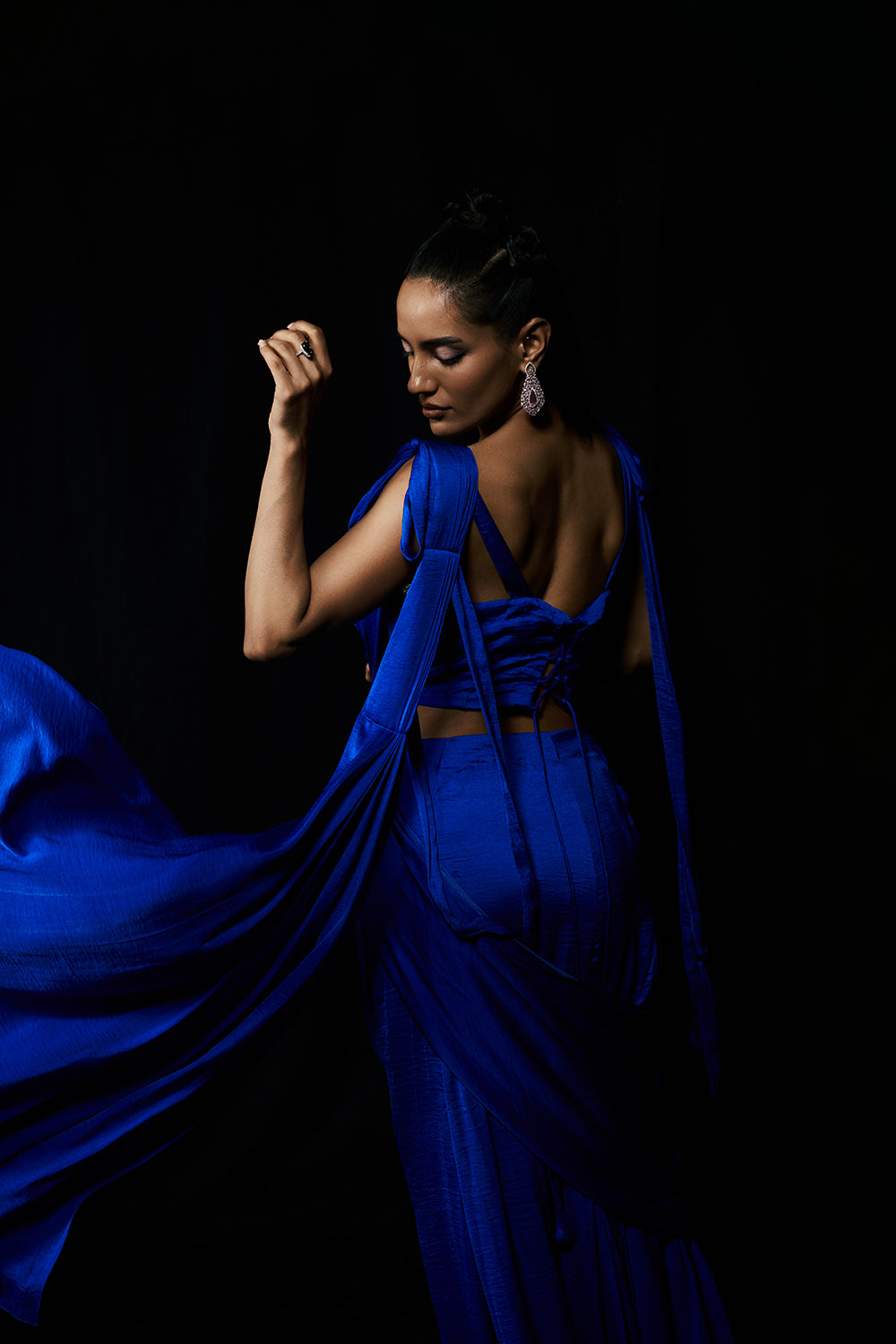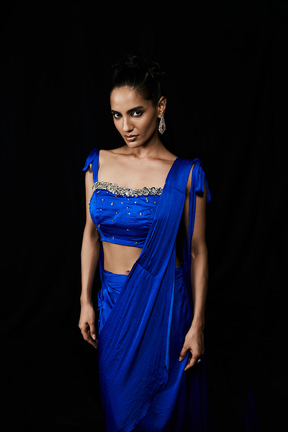 Bold and luminous, The Electra is a drape saree that embodies modern sensuality. The sculpted bustier glitters with hand-embellished crystals, while knotted straps add an unexpected edge to its elegance. In striking electric blue, this look is designed to command attention at celebrations and soirées alike.
