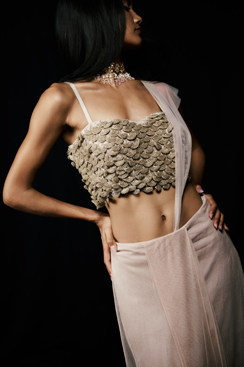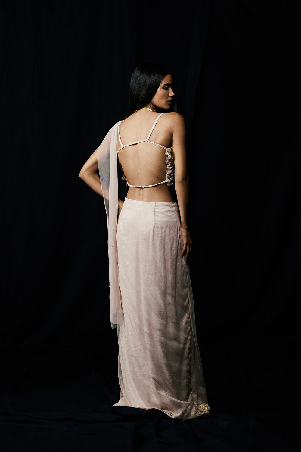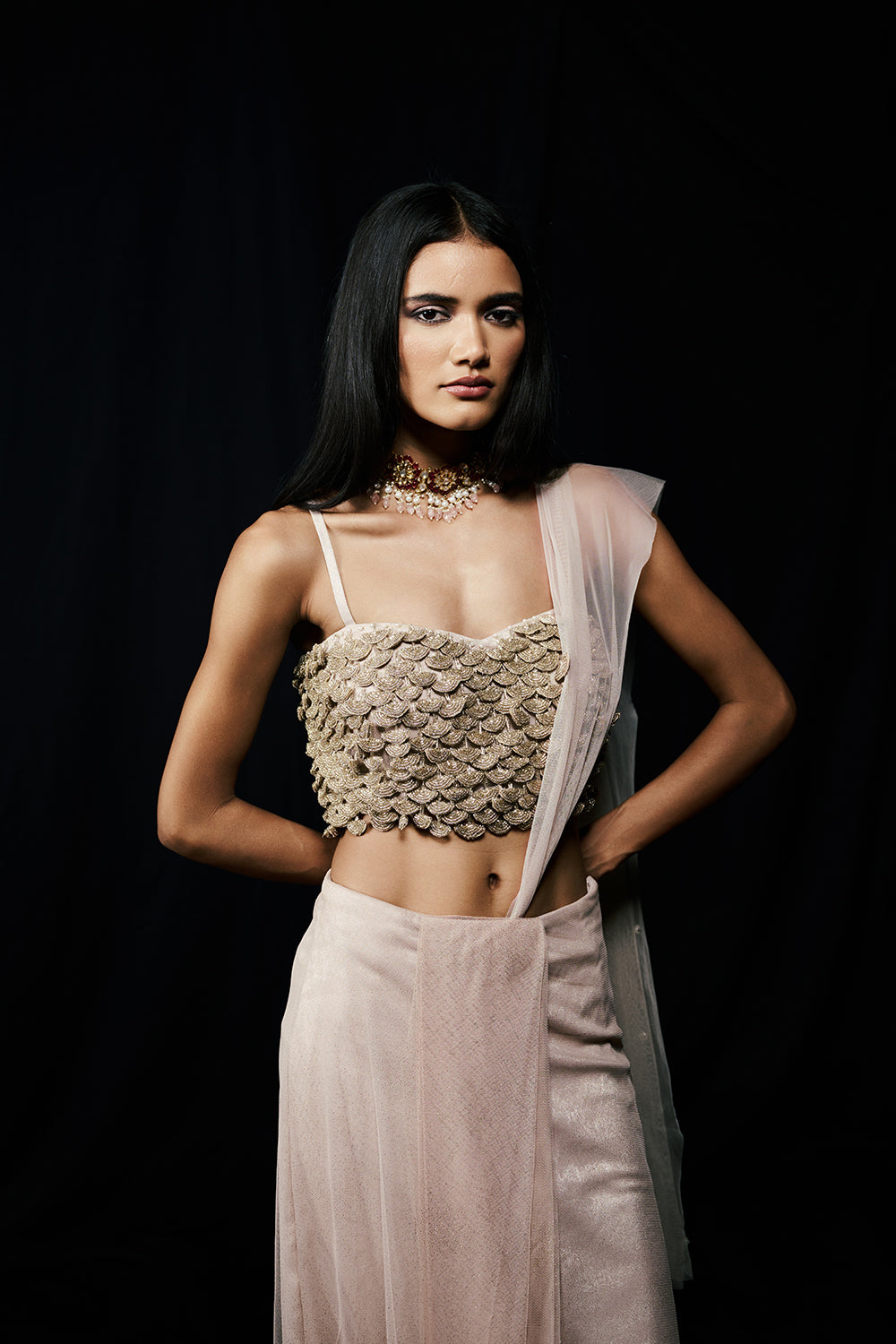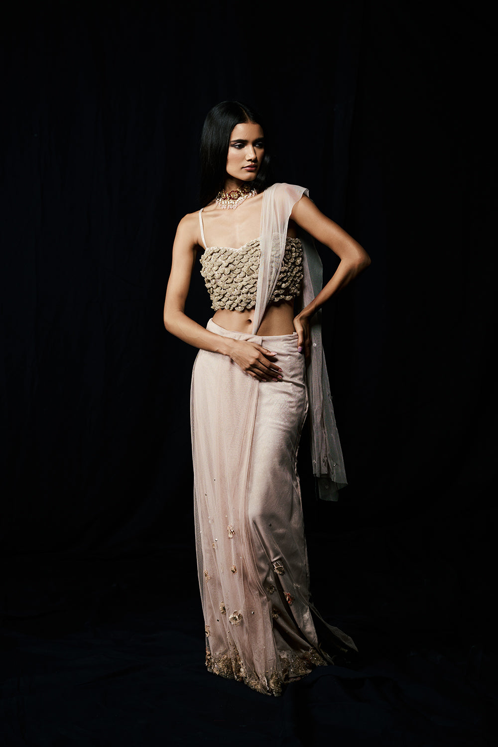 The Lyrical Set is an ode to refined grace. The meticulously beaded bustier, with its intricate floral texture, provides a captivating focal point. Paired with a soft, flowing skirt that is subtly adorned with delicate embroidery, this set creates a silhouette that is both sensual and sophisticated. The minimalist drape adds a touch of modern elegance, making it a perfect ensemble for any occasion.