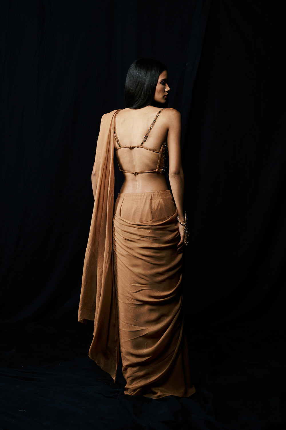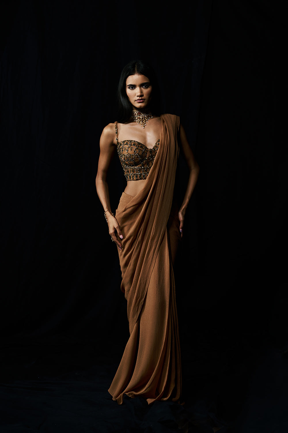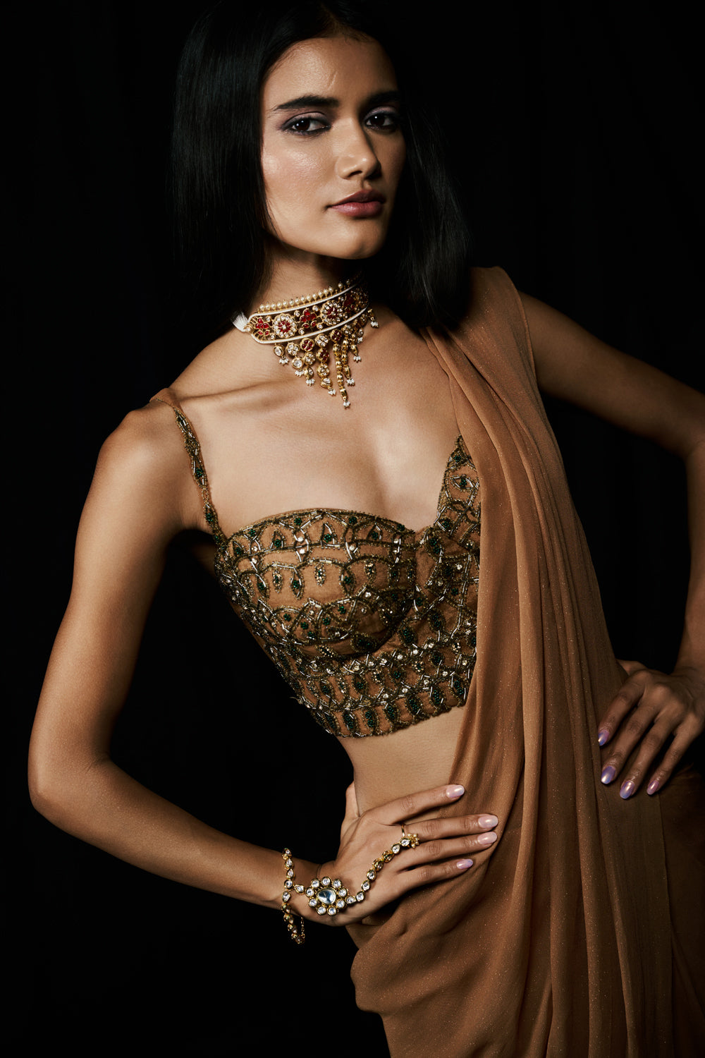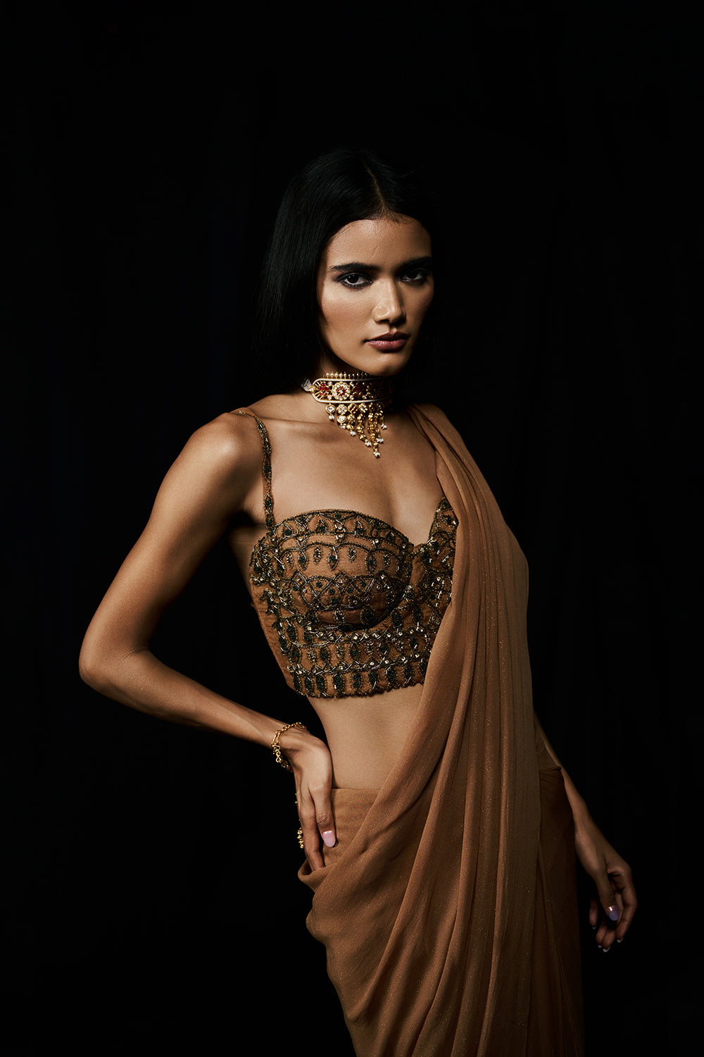 Reach your style pinnacle with the Zenith Saree. This design features a daringly low-cut blouse, balanced by intricate beadwork and a classic drape. It’s a bold combination of tradition and modern allure, created for the woman who owns her curves and is unafraid to shine at her brightest.