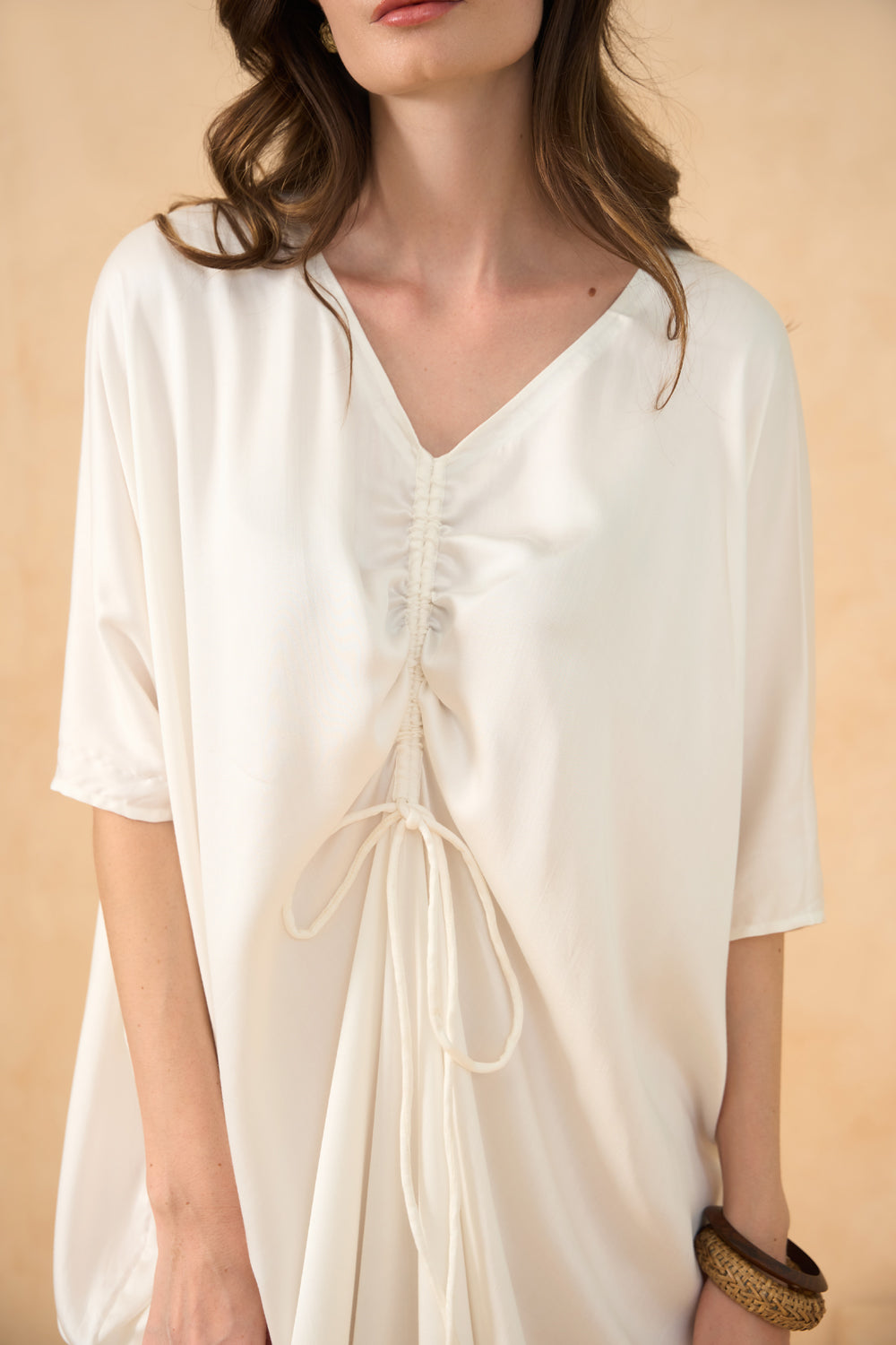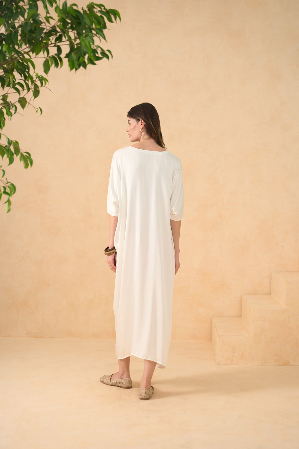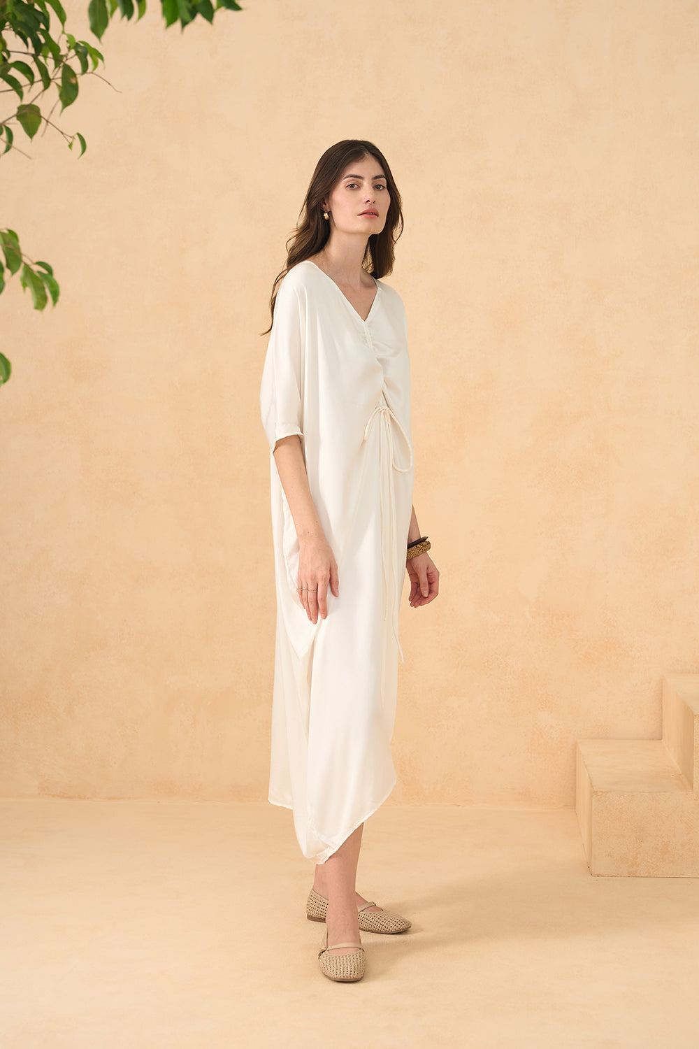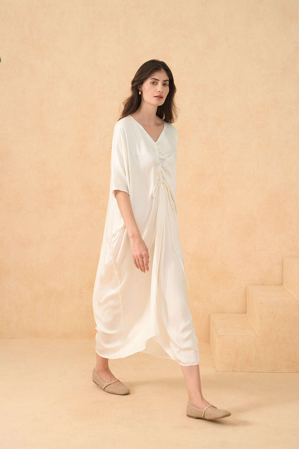 Minimalism meets movement in the Twilight Sands Kaftan. The oversized silhouette is detailed with soft pleats and adjustable ties, flowing beautifully with every step or sea breeze.